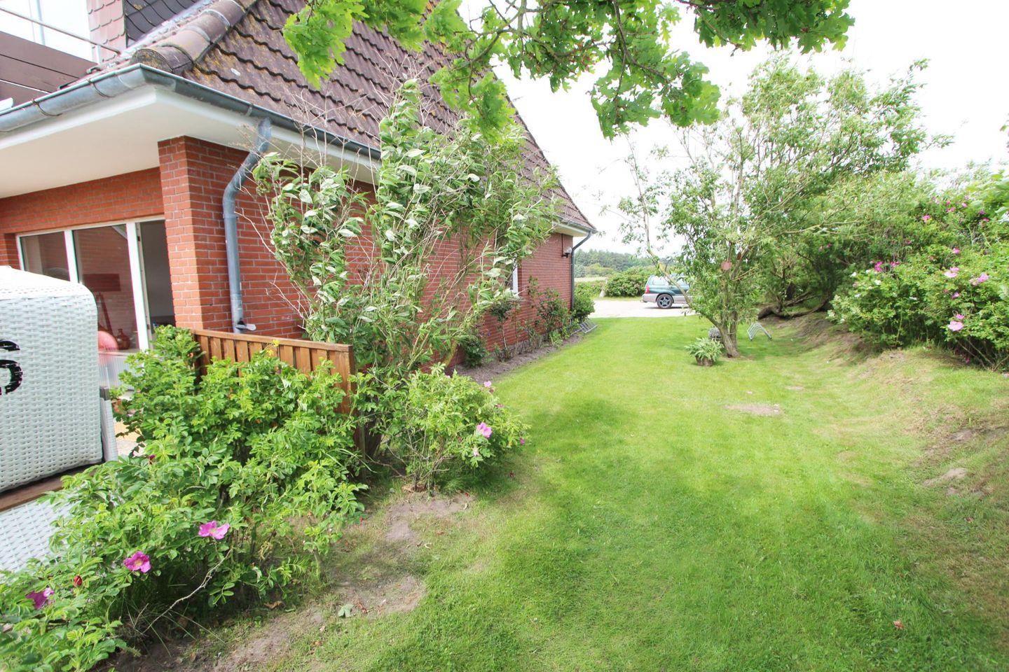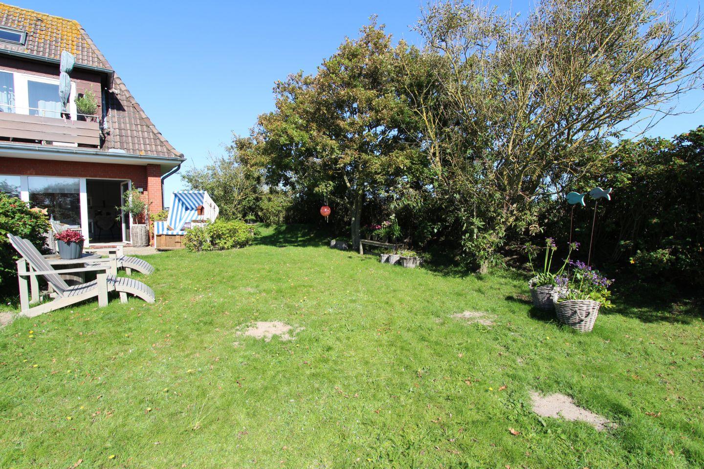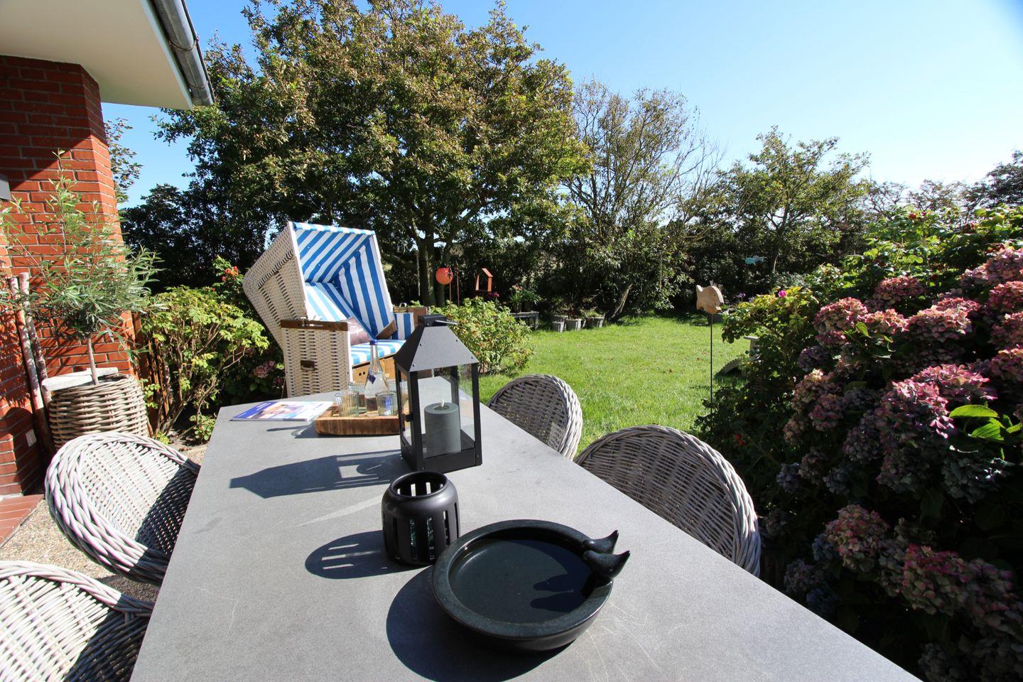 Genießen Sie den Luxus einer sonnigen Terrasse mit eigenem Strandkorb – stilvoller kann man sich auf Sylt nicht entspannen! Das grüne Grundstück ist der perfekte Rückzugsort vom Stress des Alltags.