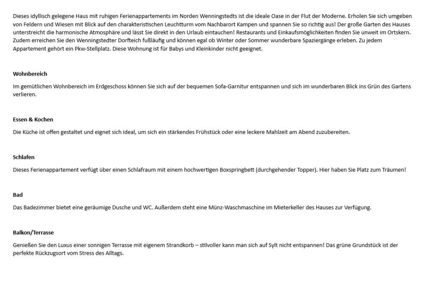 Dieses idyllisch gelegene Haus mit ruhigen Ferienappartements im Norden Wenningstedts ist die ideale Oase in der Flut der Moderne. Erholen Sie sich umgeben von Feldern und Wiesen mit Blick auf den charakteristischen Leuchtturm vom Nachbarort Kampen und spannen Sie so richtig aus! Der große Garten des Hauses unterstreicht die harmonische Atmosphäre und lässt Sie direkt in den Urlaub eintauchen! Restaurants und Einkaufsmöglichkeiten finden Sie unweit im Ortskern. Zudem erreichen Sie den Wenningstedter Dorfteich fußläufig und können egal ob Winter oder Sommer wunderbare Spaziergänge erleben. Zu jedem Appartement gehört ein Pkw-Stellplatz.