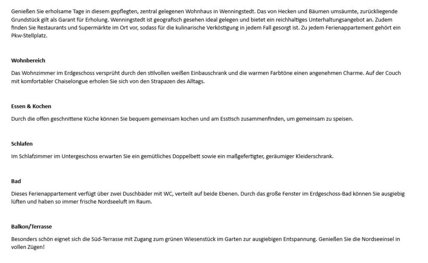 Genießen Sie erholsame Tage in diesem gepflegten, zentral gelegenen Wohnhaus in Wenningstedt. Das von Hecken und Bäumen umsäumte, zurückliegende Grundstück gilt als Garant für Erholung. Wenningstedt ist geografisch gesehen ideal gelegen und bietet ein reichhaltiges Unterhaltungsangebot an. Zudem finden Sie Restaurants und Supermärkte im Ort vor, sodass für die kulinarische Verköstigung in jedem Fall gesorgt ist. Zu jedem Ferienappartement gehört ein Pkw-Stellplatz.