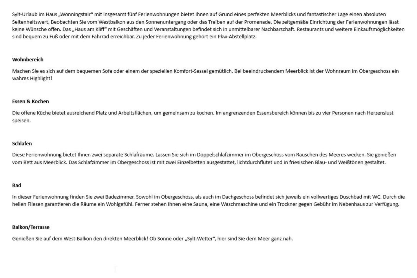 Sylt-Urlaub im Haus „Wonningstair“ mit insgesamt fünf Ferienwohnungen bietet Ihnen auf Grund eines perfekten Meerblicks und fantastischer Lage einen absoluten Seltenheitswert. Beobachten Sie vom Westbalkon aus den Sonnenuntergang oder das Treiben auf der Promenade. Die zeitgemäße Einrichtung der Ferienwohnungen lässt keine Wünsche offen. Das „Haus am Kliff“ mit Geschäften und Veranstaltungen befindet sich in unmittelbarer Nachbarschaft. Restaurants und weitere Einkaufsmöglichkeiten sind bequem zu Fuß oder mit dem Fahrrad erreichbar. Zu jeder Ferienwohnung gehört ein Pkw-Abstellplatz.