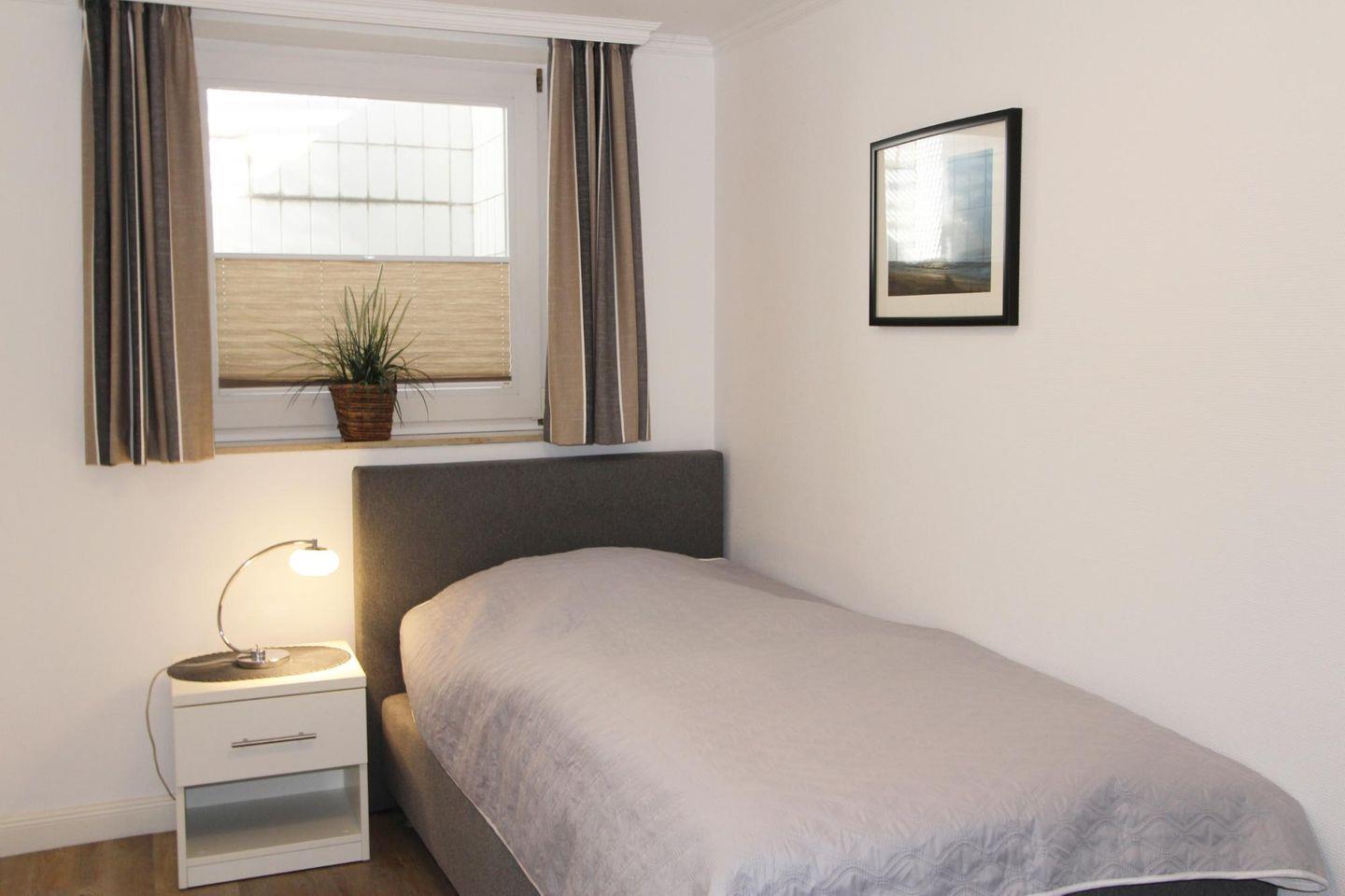 Im Untergeschoss der Ferienwohnung finden Sie drei Schlafzimmer. Das Doppelschlafzimmer bietet ein komfortables Boxspring-Bett (durchgehender Topper) und ein zweites TV-Gerät. Die beiden weiteren Schlafräume verfügen über je ein Einzelbett (Boxspring).