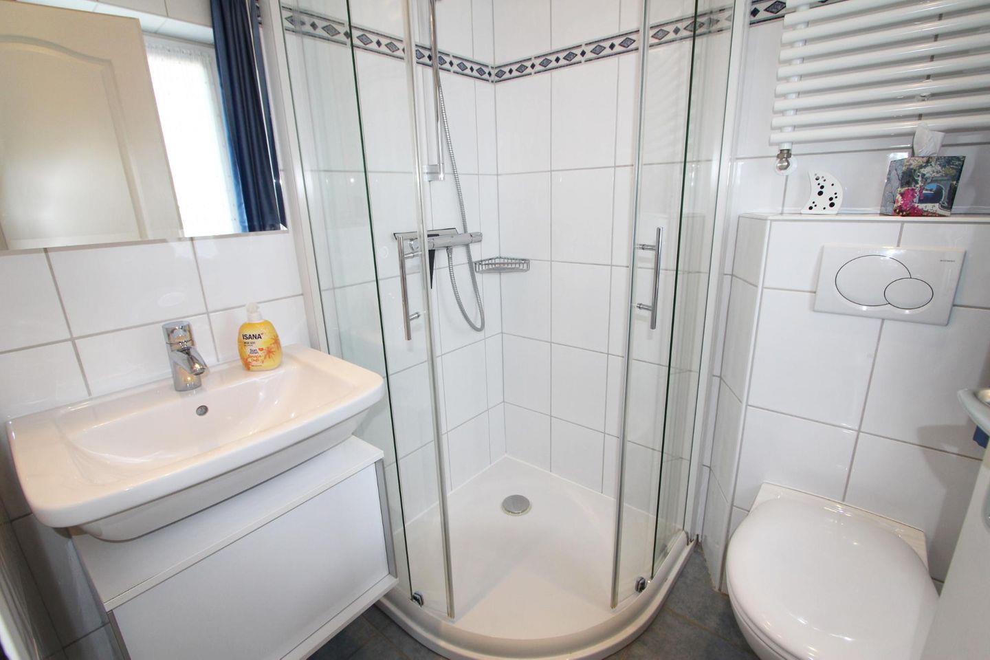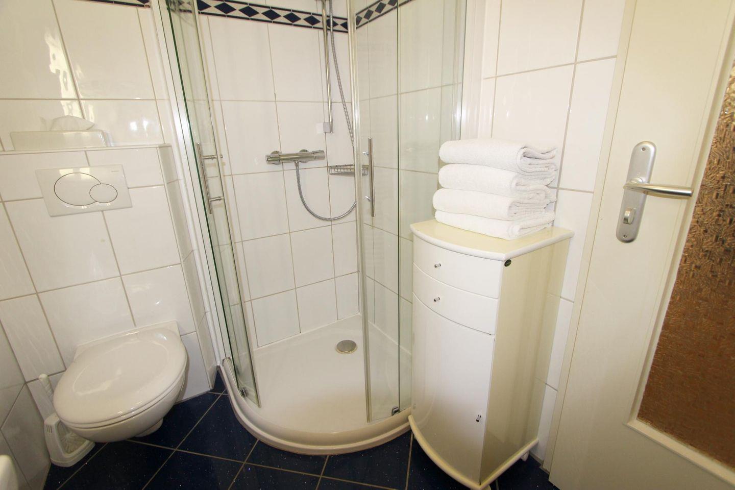 In dieser Ferienwohnung befinden sich zwei Badezimmer. Diese verteilen sich auf die beiden Ebenen und bieten jeweils Dusche und WC. Ferner stehen Ihnen eine Sauna, eine Waschmaschine und ein Trockner gegen Gebühr im Nebenhaus zur Verfügung.