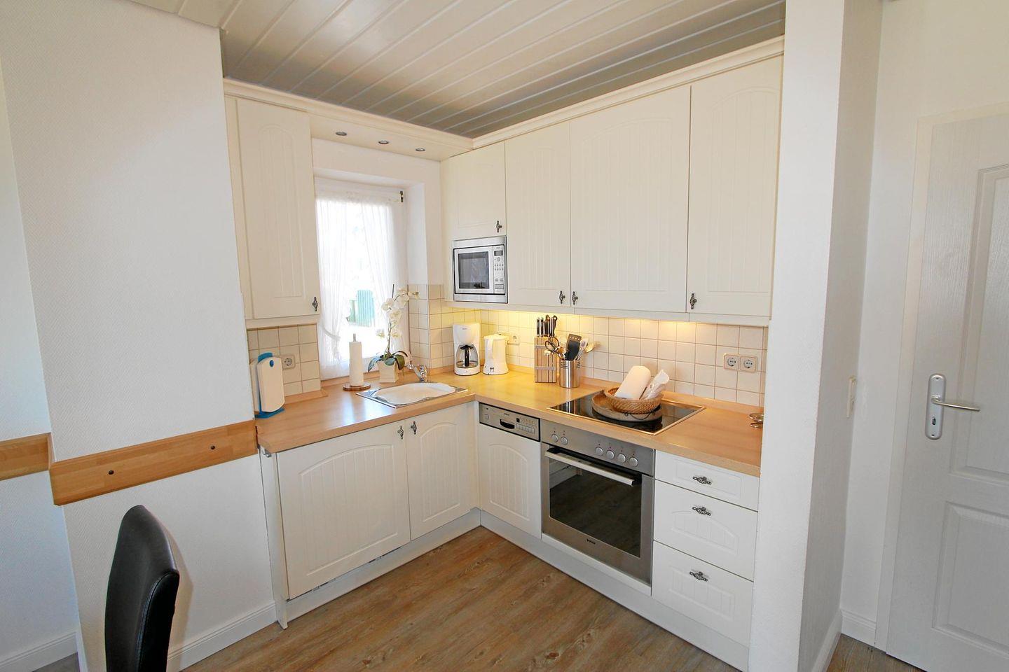 Der Essbereich befindet sich im großen Wohnraum im Erdgeschoss und bietet Platz für vier Personen. Die offene Küche bietet ausreichend Platz und Arbeitsflächen, um gemeinsam zu kochen.