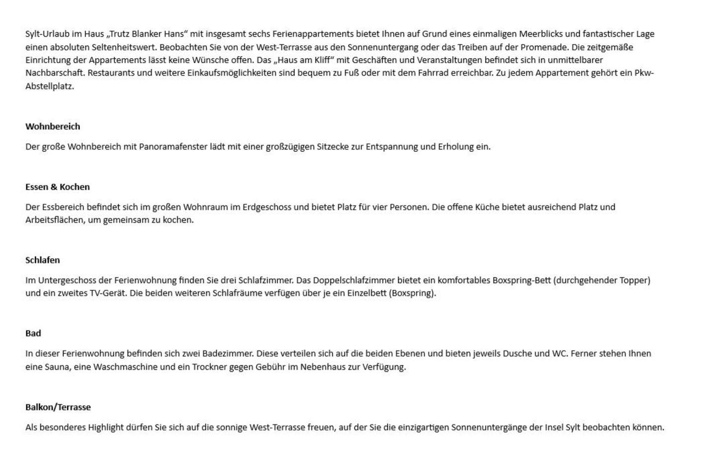 Sylt-Urlaub im Haus „Trutz Blanker Hans“ mit insgesamt sechs Ferienappartements bietet Ihnen auf Grund eines einmaligen Meerblicks und fantastischer Lage einen absoluten Seltenheitswert. Beobachten Sie von der West-Terrasse aus den Sonnenuntergang oder das Treiben auf der Promenade. Die zeitgemäße Einrichtung der Appartements lässt keine Wünsche offen. Das „Haus am Kliff“ mit Geschäften und Veranstaltungen befindet sich in unmittelbarer Nachbarschaft. Restaurants und weitere Einkaufsmöglichkeiten sind bequem zu Fuß oder mit dem Fahrrad erreichbar. Zu jedem Appartement gehört ein Pkw-Abstellplatz.