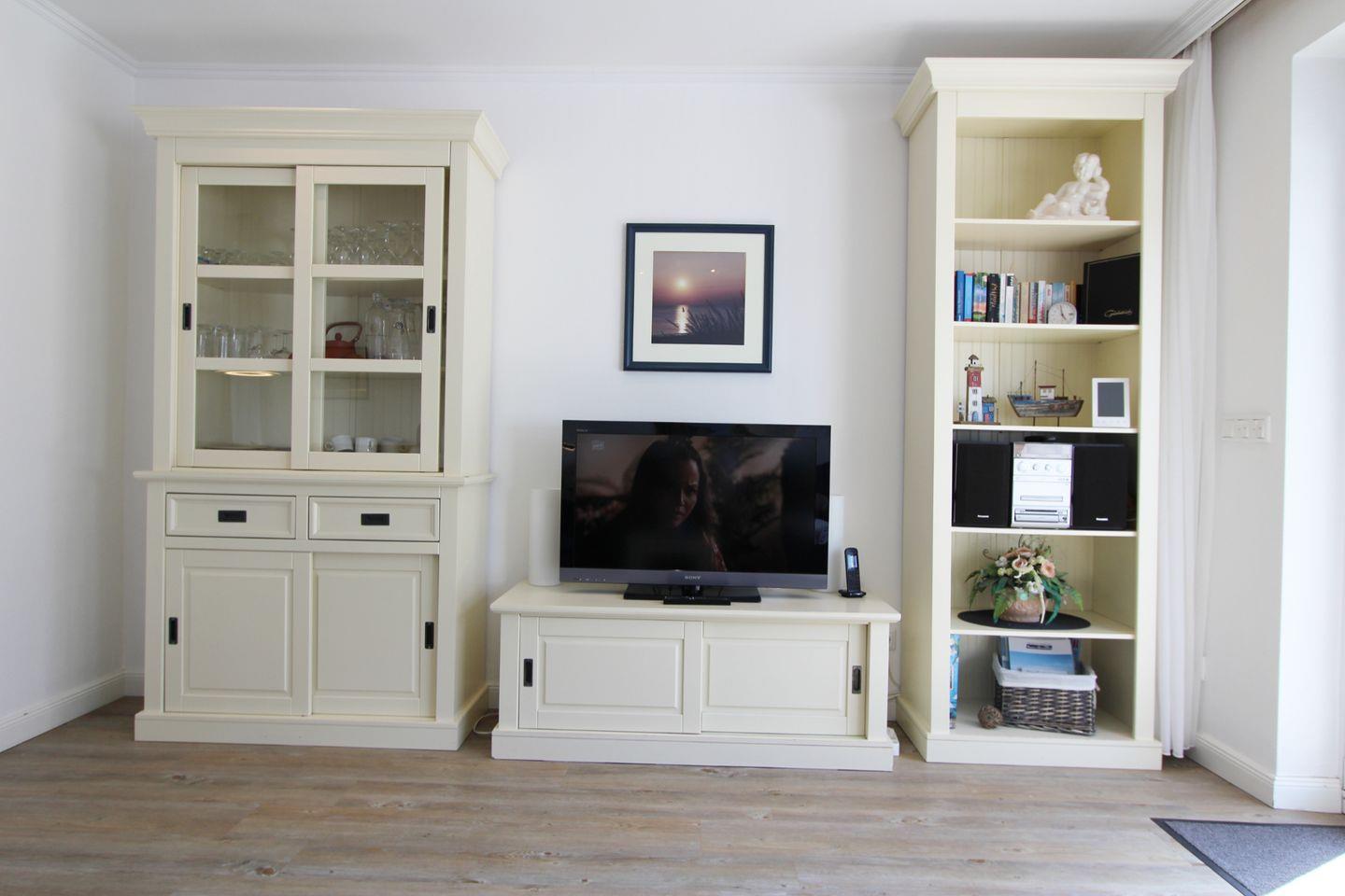 Im Untergeschoss der Ferienwohnung finden Sie drei Schlafzimmer. Das Doppelschlafzimmer bietet ein komfortables Boxspring-Bett (durchgehender Topper) und ein zweites TV-Gerät. Die beiden weiteren Schlafräume verfügen über je ein Einzelbett (Boxspring).