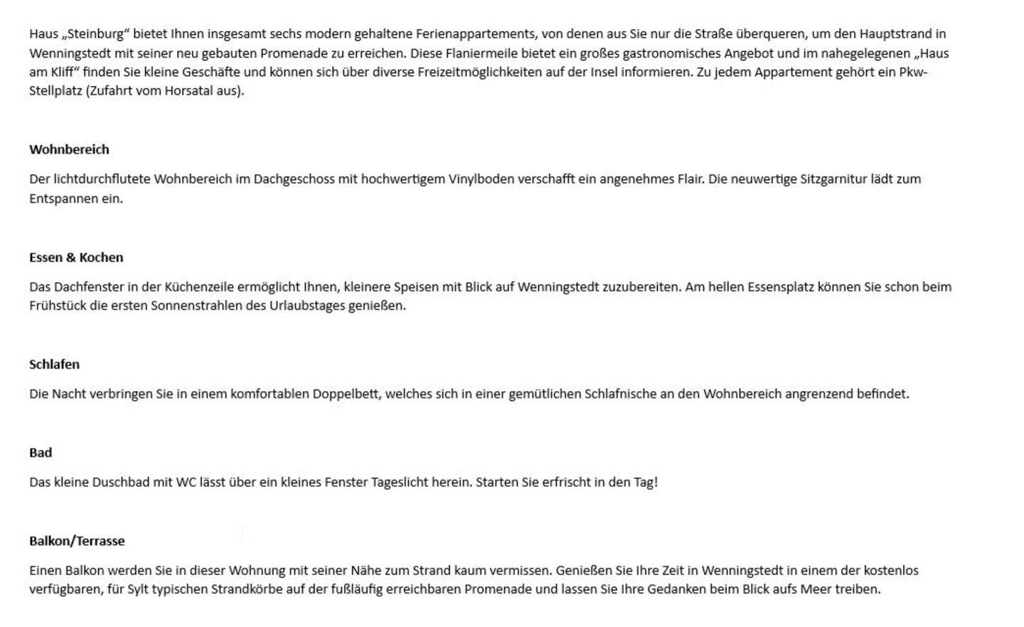 Haus „Steinburg“ bietet Ihnen insgesamt sechs modern gehaltene Ferienappartements, von denen aus Sie nur die Straße überqueren, um den Hauptstrand in Wenningstedt mit seiner neu gebauten Promenade zu erreichen. Diese Flaniermeile bietet ein großes gastronomisches Angebot und im nahegelegenen „Haus am Kliff“ finden Sie kleine Geschäfte und können sich über diverse Freizeitmöglichkeiten auf der Insel informieren. Zu jedem Appartement gehört ein Pkw-Stellplatz (Zufahrt vom Horsatal aus). Ab 2026 sind leider keine Haustiere mehr erlaubt.