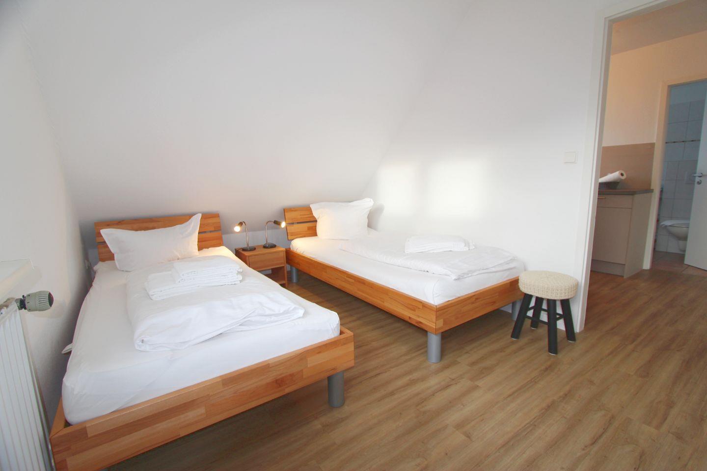 Dieses Ferienappartement verfügt über zwei separate Schlafräume. Im Schlafzimmer auf der Wohnebene nächtigen Sie in zwei komfortablen Einzelbetten. Der Schlafraum im Dachgeschoss, der über eine Wendeltreppe zu erreichen ist, bietet ein Doppelbett und fantastischen Ausblick auf die Nordsee. Ein einmaliges Erlebnis morgens aufzustehen und direkt einen Blick auf die blaue See zu werfen!