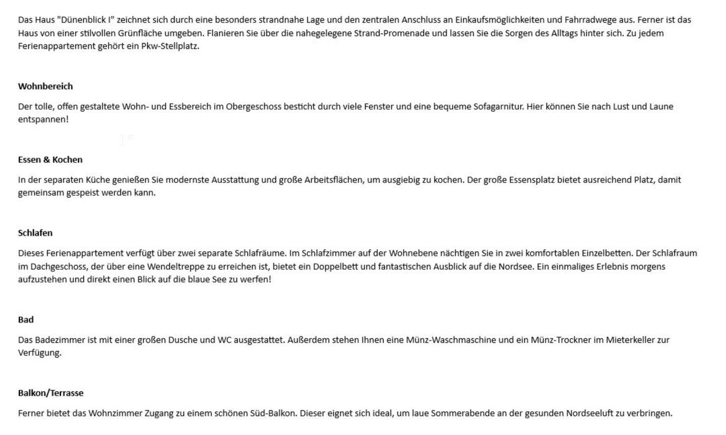 Das Haus "Dünenblick I" zeichnet sich durch eine besonders strandnahe Lage und den zentralen Anschluss an Einkaufsmöglichkeiten und Fahrradwege aus. Ferner ist das Haus von einer stilvollen Grünfläche umgeben. Flanieren Sie über die nahegelegene Strand-Promenade und lassen Sie die Sorgen des Alltags hinter sich. Zu jedem Ferienappartement gehört ein Pkw-Stellplatz.