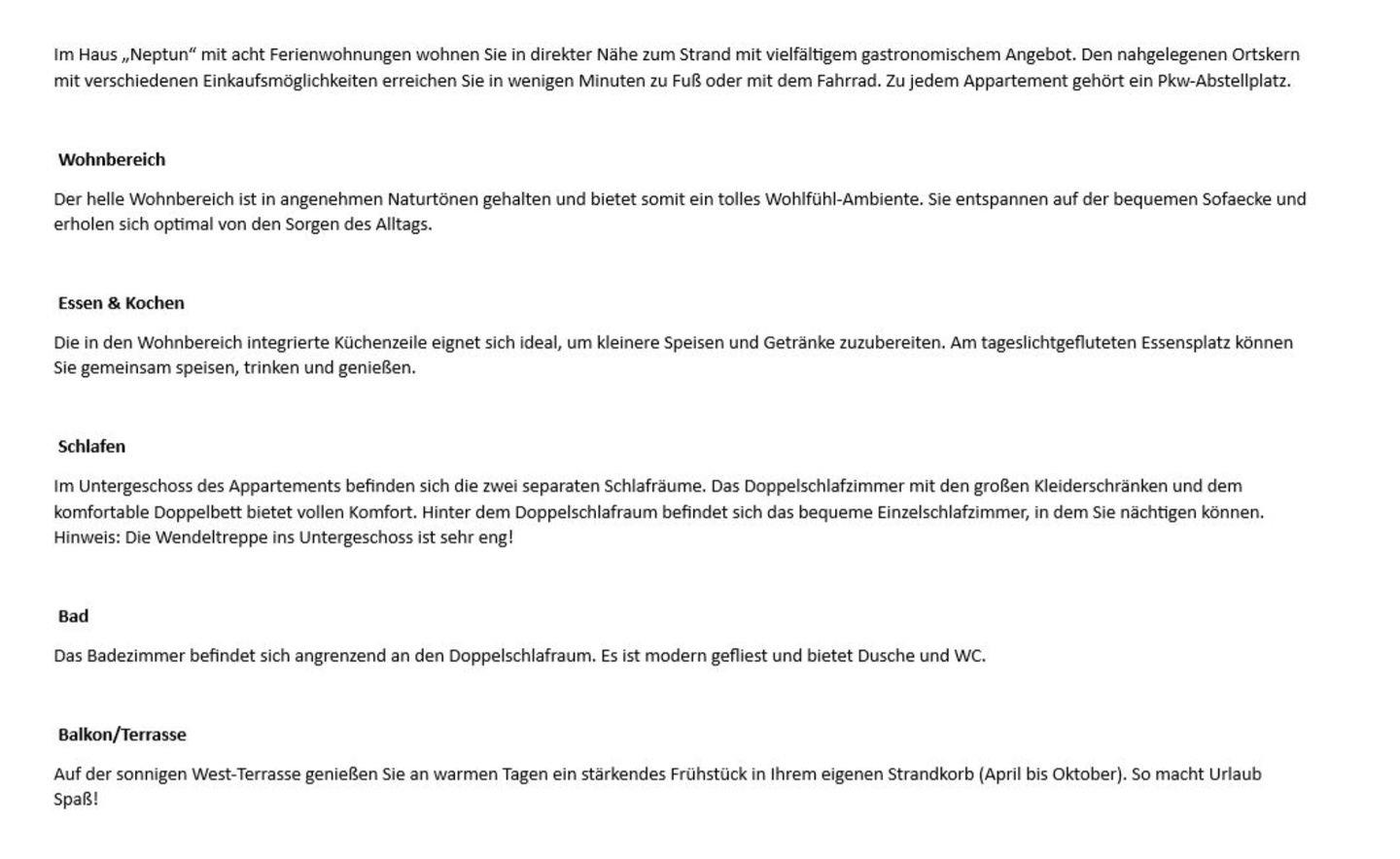 Im Haus „Neptun“ mit acht Ferienwohnungen wohnen Sie in direkter Nähe zum Strand mit vielfältigem gastronomischem Angebot. Den nahgelegenen Ortskern mit verschiedenen Einkaufsmöglichkeiten erreichen Sie in wenigen Minuten zu Fuß oder mit dem Fahrrad. Zu jedem Appartement gehört ein Pkw-Abstellplatz.