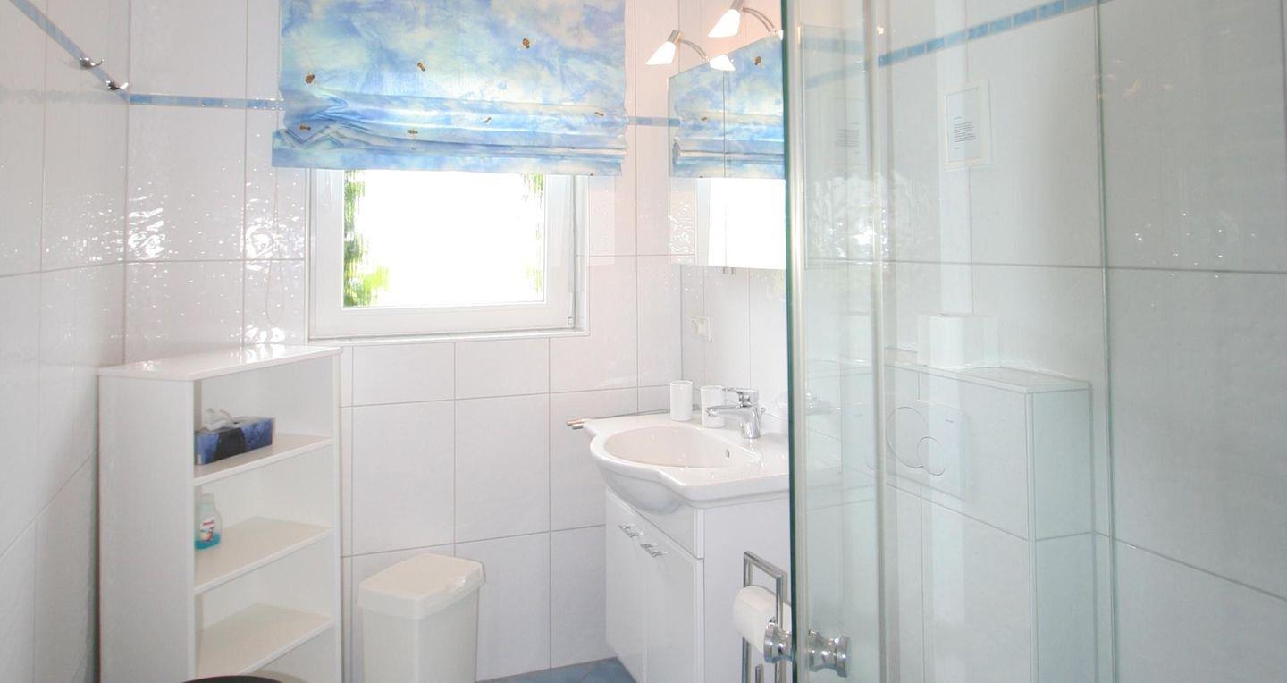 Das Bad mit seinen hellen Fliesen und der modernen Duschkabine bietet ausreichend Platz für die tägliche Körperpflege. Außerdem steht Ihnen eine Münz-Waschmaschine im Mieterkeller zur Verfügung.