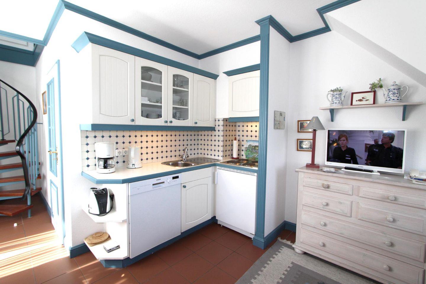 Die angrenzende Eck-Küche bietet die Möglichkeit, kleinere Speisen und Getränke zuzubereiten. Am hellen Essensplatz direkt am Fenster können Sie gemeinsam Speisen und die Erlebnisse des Urlaubs Revue passieren lassen.