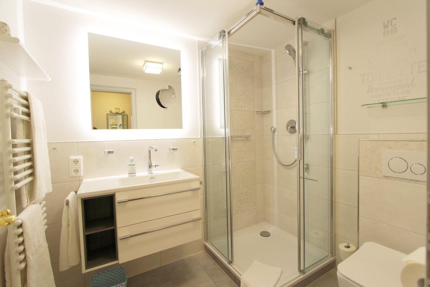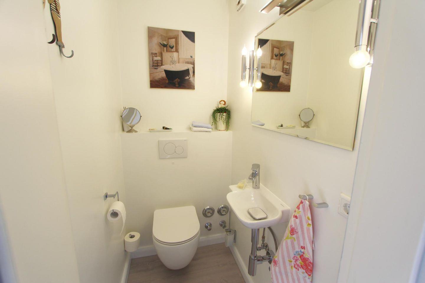 Im Erdgeschoss der Ferienwohnung kann ein kleines Gäste-WC genutzt werden. Darüber hinaus befindet sich im Untergeschoss ein vollwertiges, 2021 renoviertes Badezimmer mit großzügiger Dusche, Handtuchheizung und WC. Im Mieterkeller stehen Ihnen eine Münz-Waschmaschine und ein Münz-Trockner zur Verfügung.