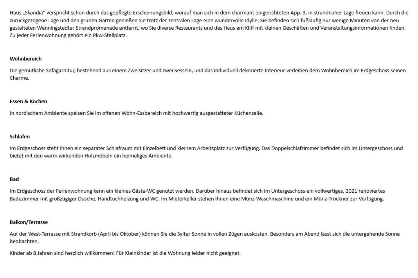 Haus „Skandia“ verspricht schon durch das gepflegte Erscheinungsbild, worauf man sich in dem charmant eingerichteten App. 3, in strandnaher Lage freuen kann. Durch die zurückgezogene Lage und den grünen Garten genießen Sie trotz der zentralen Lage eine wundervolle Idylle. Sie befinden sich fußläufig nur wenige Minuten von der neu gestalteten Wenningstedter Strandpromenade entfernt, wo Sie diverse Restaurants und das Haus am Kliff mit kleinen Geschäften und Veranstaltungsinformationen finden. Zu jeder Ferienwohnung gehört ein Pkw-Stellplatz.