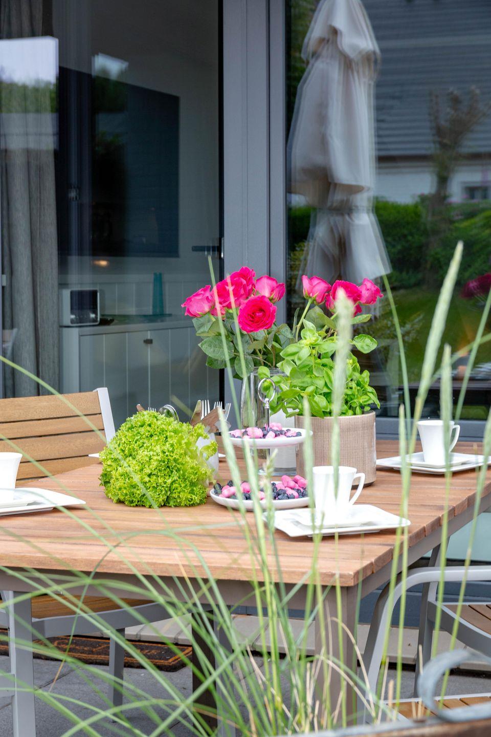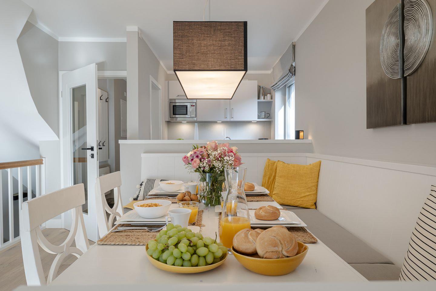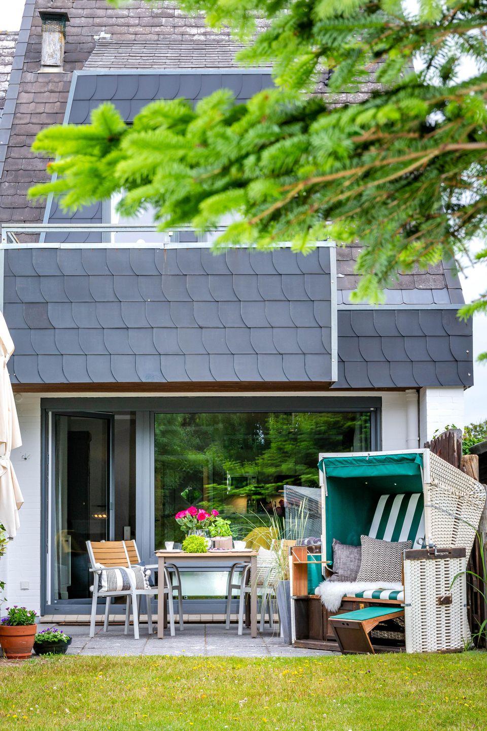 Das Herzstück bildet der lichtdurchflutete Wohnraum, der mit seiner großen Fensterfront den Blick auf die windgeschützte Süd-Terrasse freigibt, welche von morgens bis abends in der Sonne liegt. Der originale Sylter Strandkorb lädt an kühlen Tagen zum Sonnenbad ein.