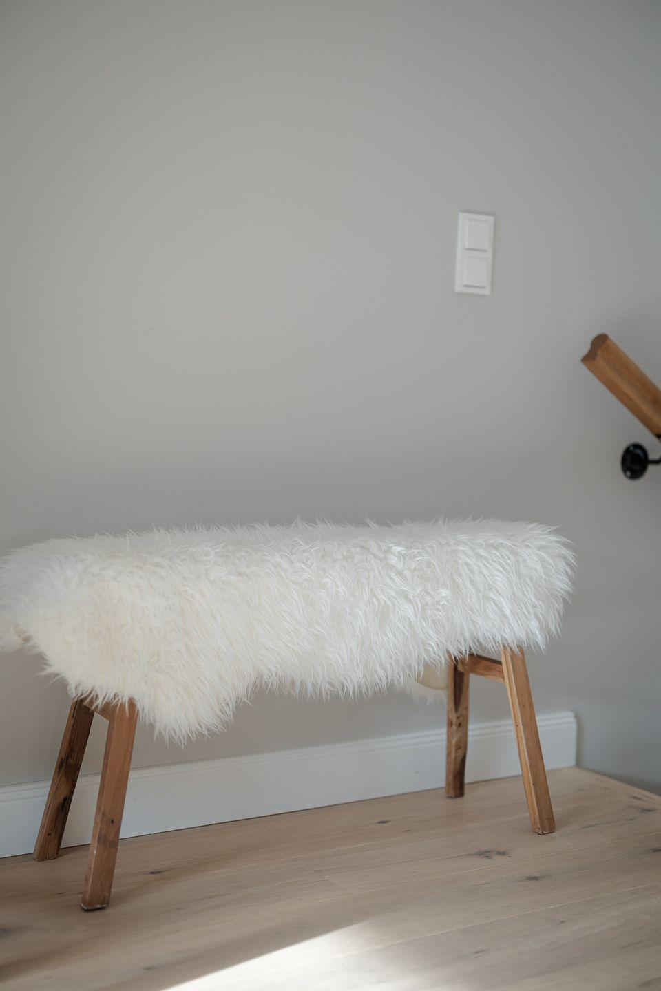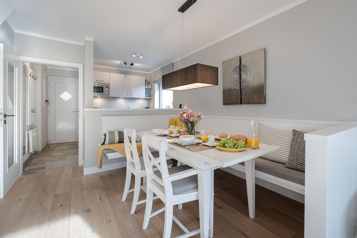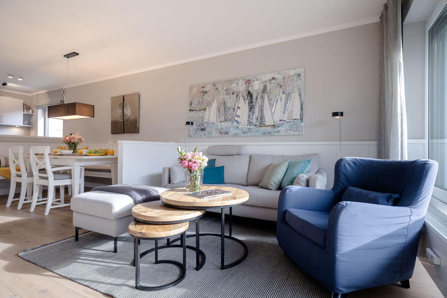 Das Herzstück bildet der lichtdurchflutete Wohnraum, der mit seiner großen Fensterfront den Blick auf die windgeschützte Süd-Terrasse freigibt, welche von morgens bis abends in der Sonne liegt. Der originale Sylter Strandkorb lädt an kühlen Tagen zum Sonnenbad ein.