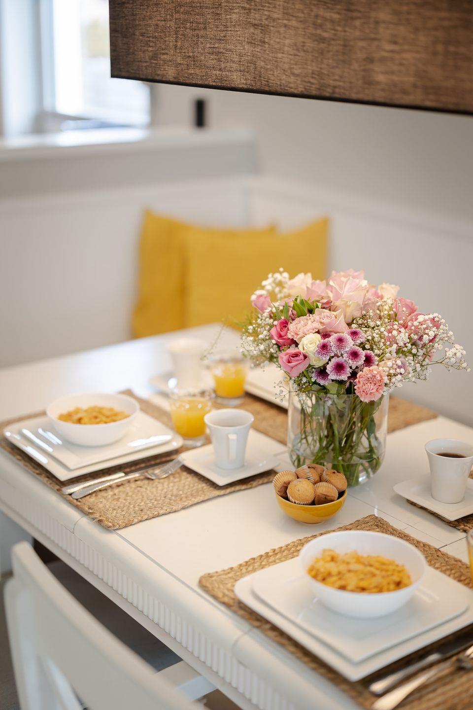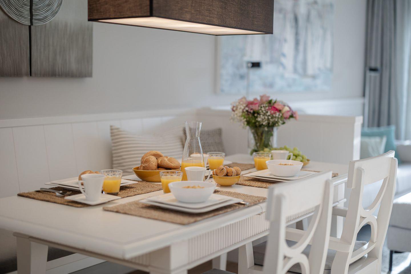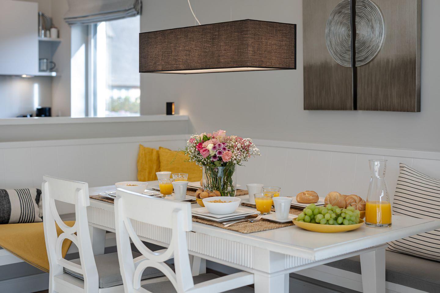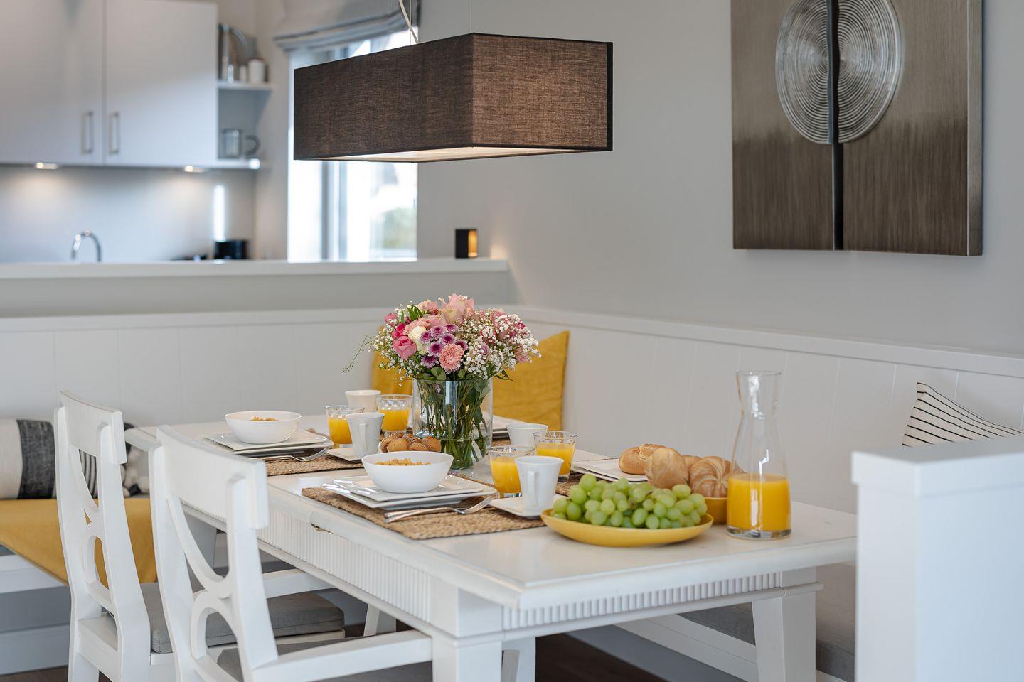 Im Wohnbereich, der durch sein helles Eichenparkett Behaglichkeit ausstrahlt, können Sie auf gemütlichen Sofa-Elementen die Seele baumeln lassen und auf dem Smart TV Ihre Lieblingsfilme über Netflix & Co schauen, oder am stilvollen Esstisch gesellige Stunden verbringen. Hier grenzt zudem die offene Küche an, sodass das Kochen zum gemeinsamen Erlebnis werden kann. Durch die hochwertige Ausstattung wird die Selbstversorgung für Sie zum Vergnügen.