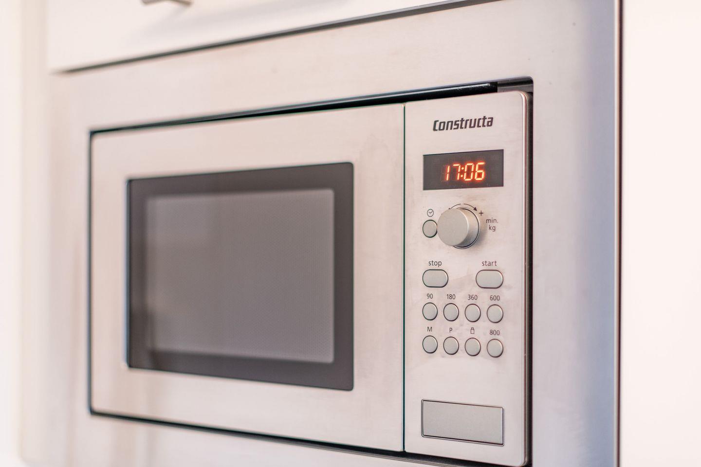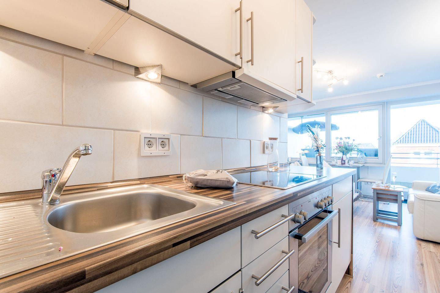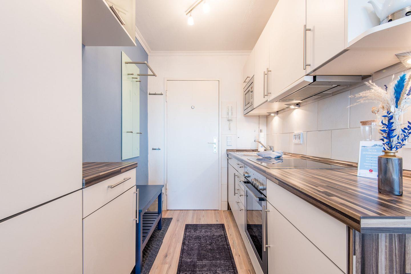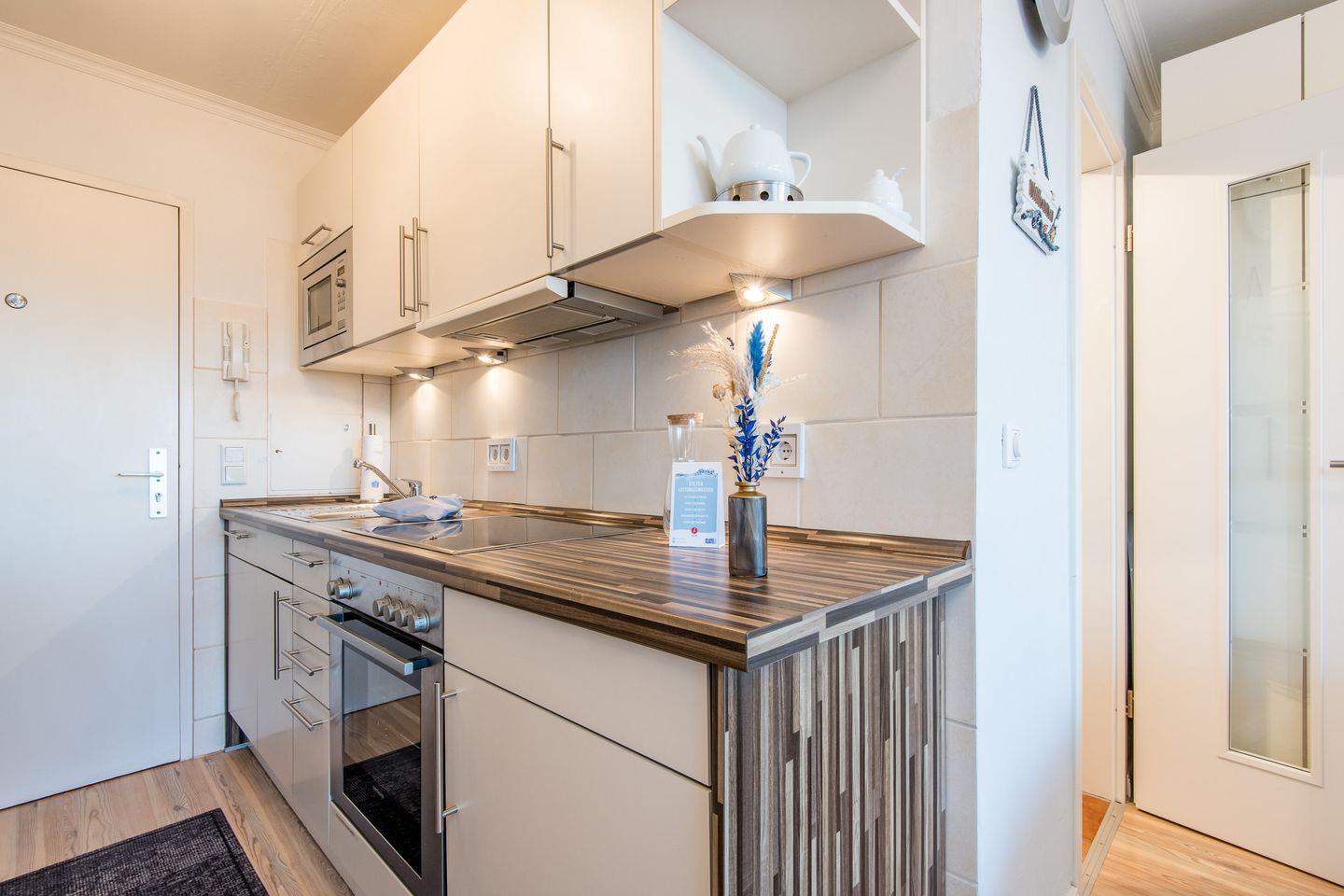 Die offene Einbauküche ist mit allem nötigen Komfort ausgestattet, inklusive Geschirrspüler, Mikrowelle, Backofen und Kochfeld. Hier können Sie unkompliziert Mahlzeiten zubereiten und sich wie zu Hause fühlen.