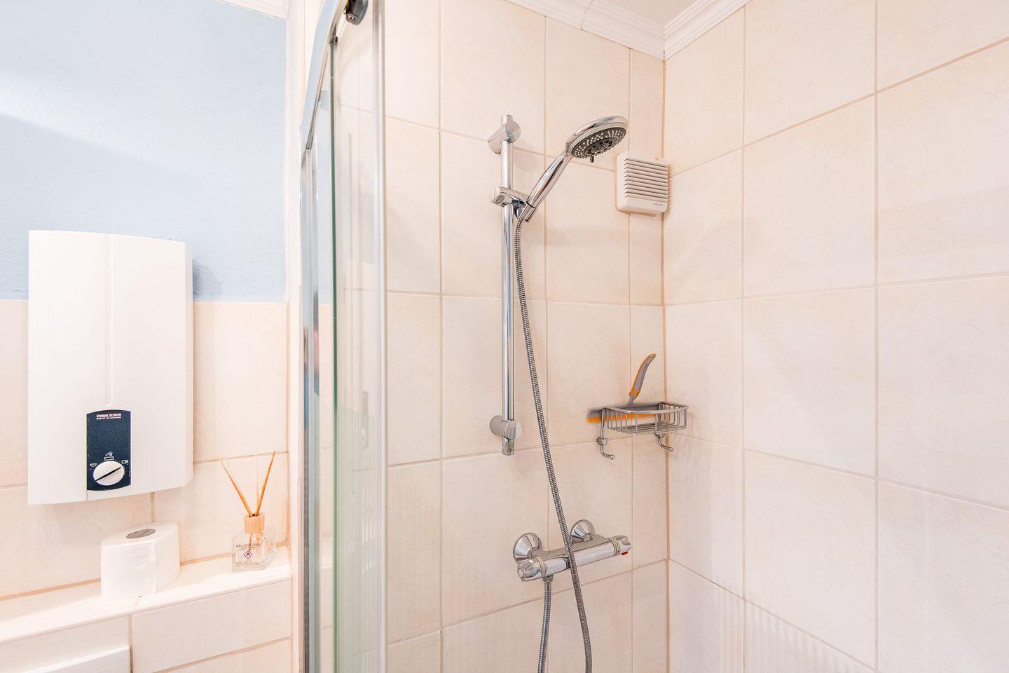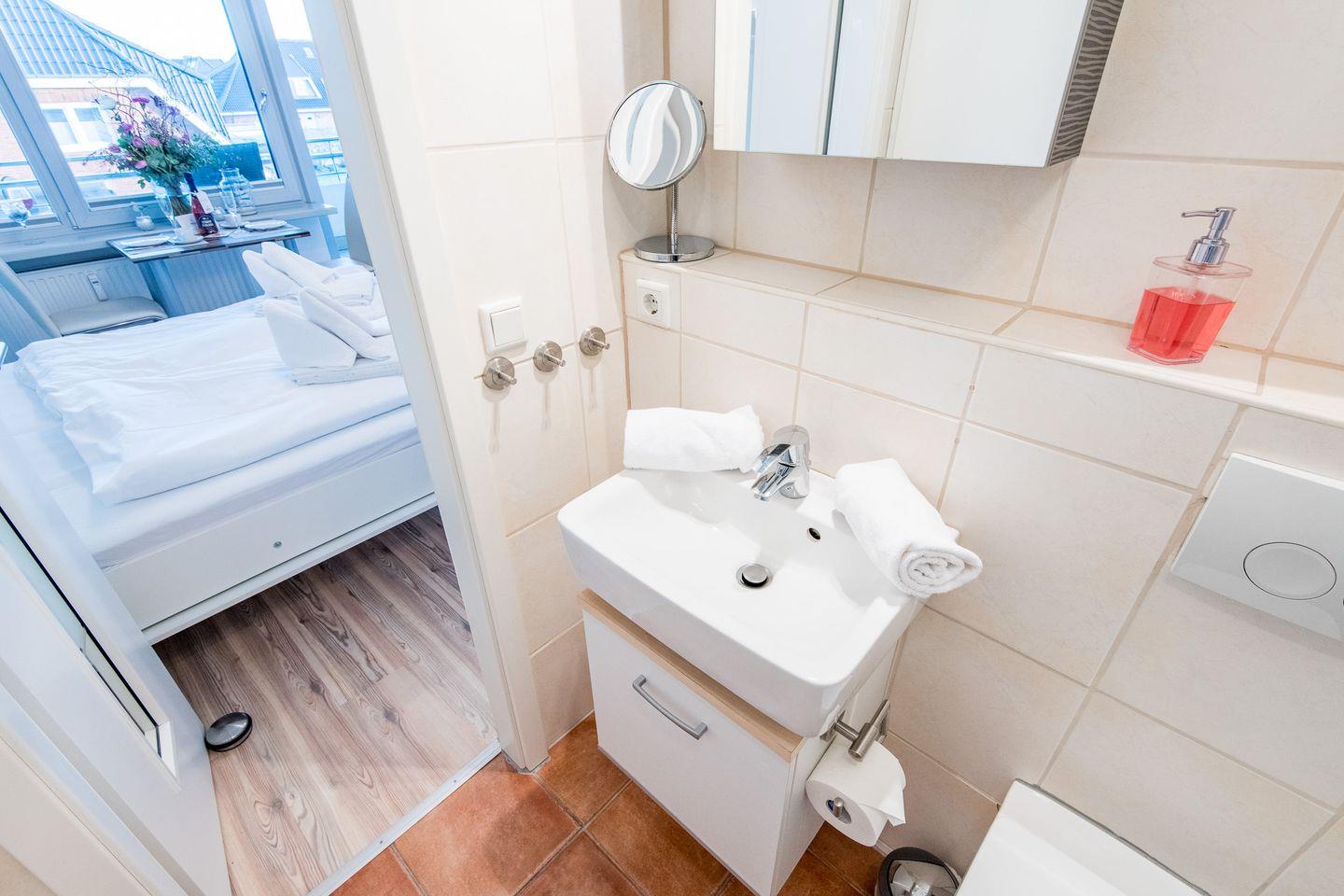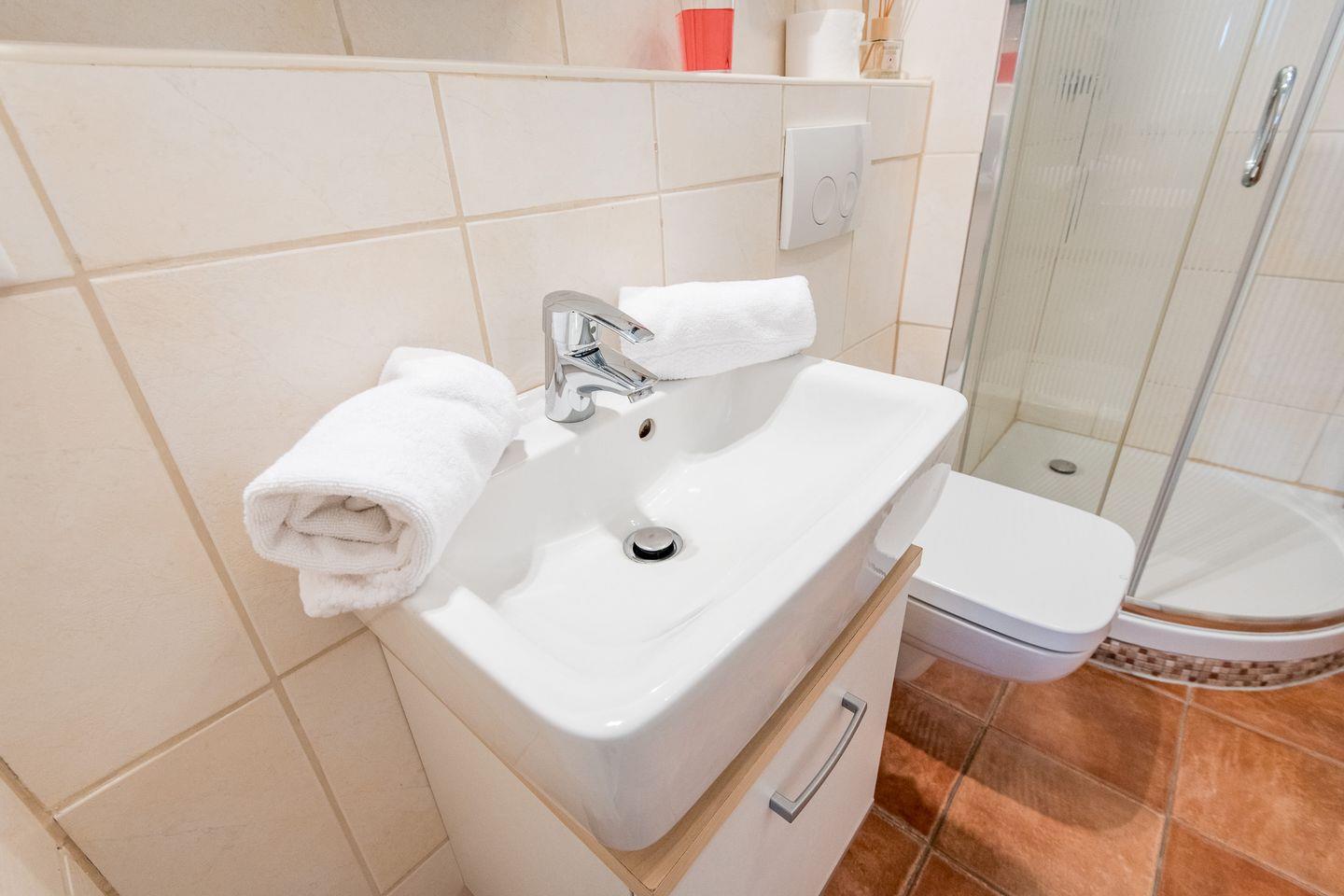 Das moderne Badezimmer ist mit einer Dusche und einem WC ausgestattet. Die funktionale Gestaltung bietet Ihnen den nötigen Komfort für Ihren Aufenthalt.