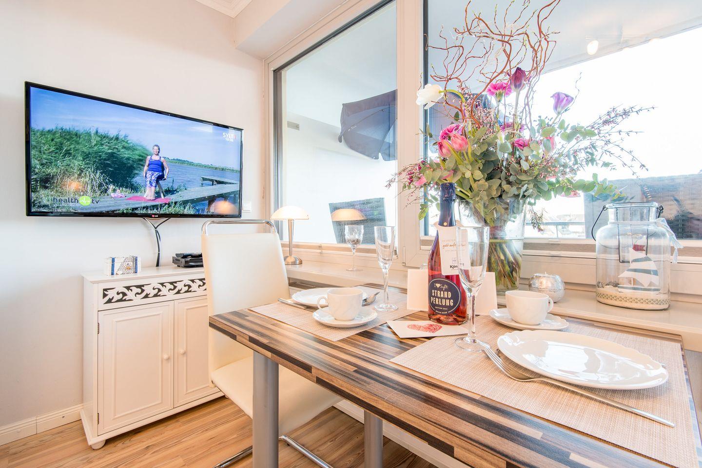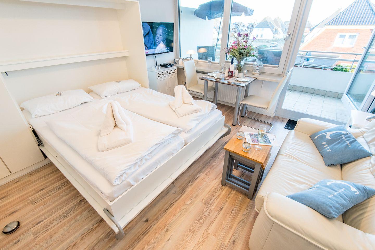 Der Wohn-/Schlafbereich ist mit einem komfortablen Schrankbett (160x200 cm) ausgestattet, das tagsüber dezent verstaut werden kann, um den Raum optimal zu nutzen. Ein TV sorgt für Unterhaltung, und die gemütliche Essecke mit zwei Stühlen bietet Platz für gemeinsame Mahlzeiten. Der direkte Zugang zum möblierten Ostbalkon lädt dazu ein, die Morgensonne zu genießen und frische Meeresluft zu tanken.