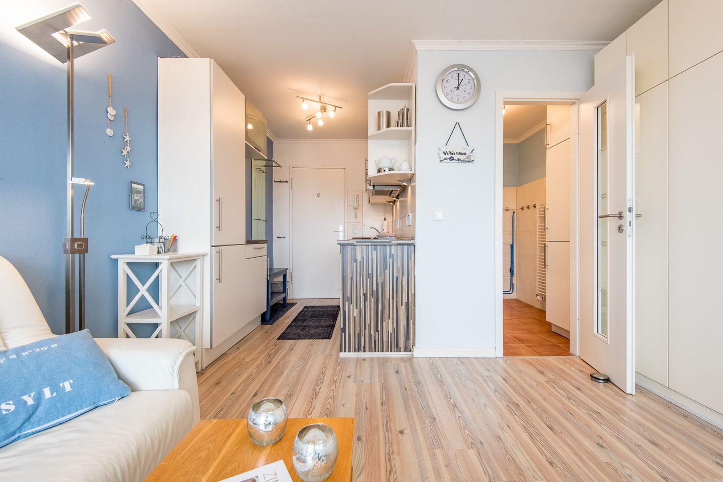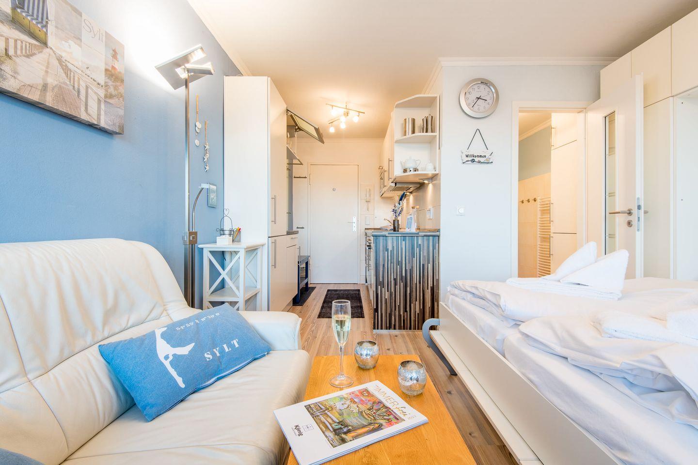 Diese modernisierte 1-Zimmer-Ferienwohnung auf ca. 28 qm bietet alles, was Sie für einen erholsamen Urlaub auf Sylt benötigen. Die Wohnung liegt direkt am beliebten Strandübergang in der Seestraße, näher am Meer geht es kaum. Ideal für Paare oder Alleinreisende, die einen entspannten Aufenthalt in unmittelbarer Nähe zum Strand suchen.
