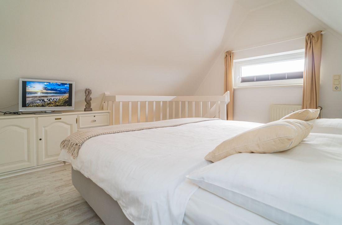 Ein modernes Schlafzimmer mit einem Boxspringbett ( 160x200 ) und TV Fernseher.