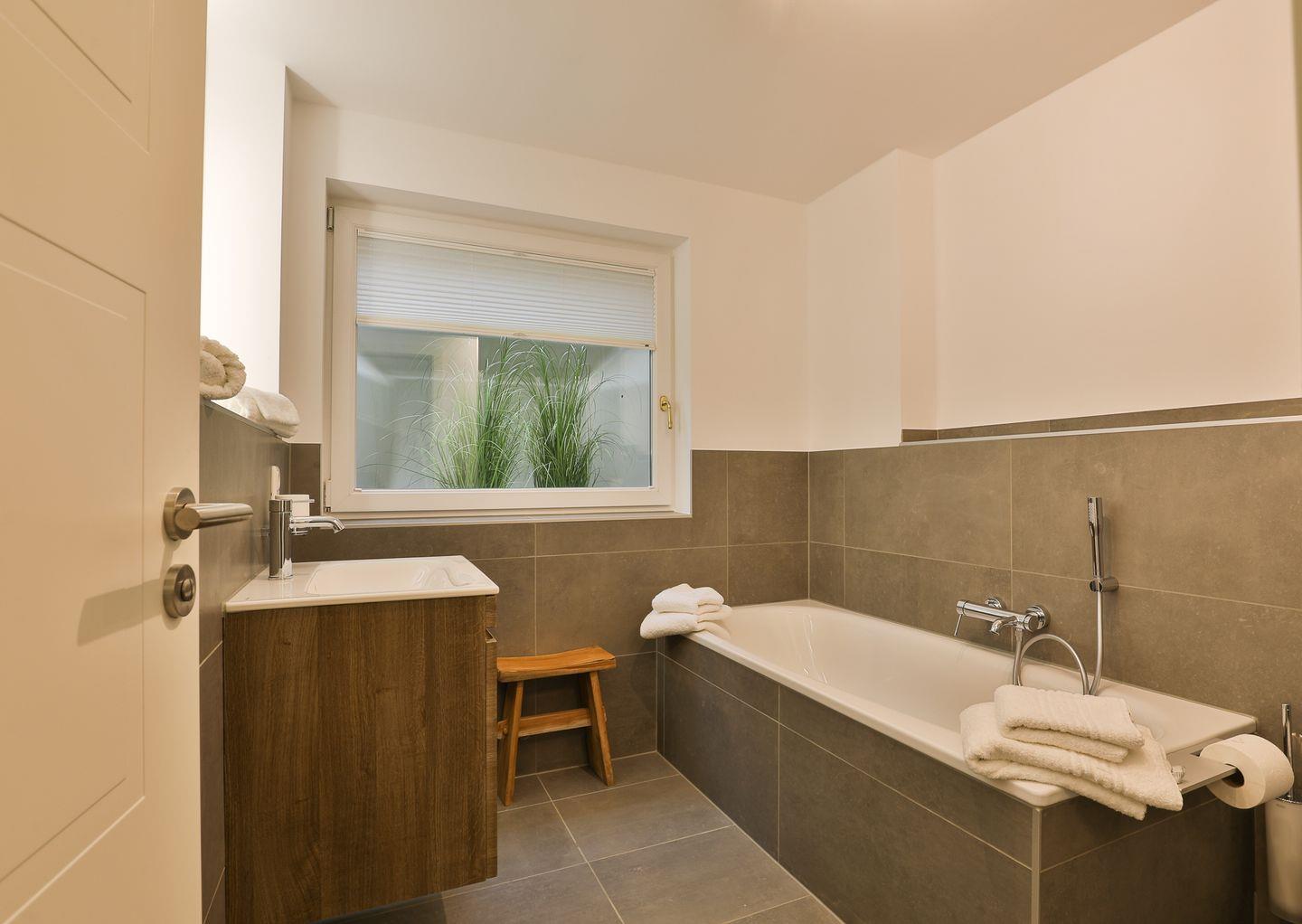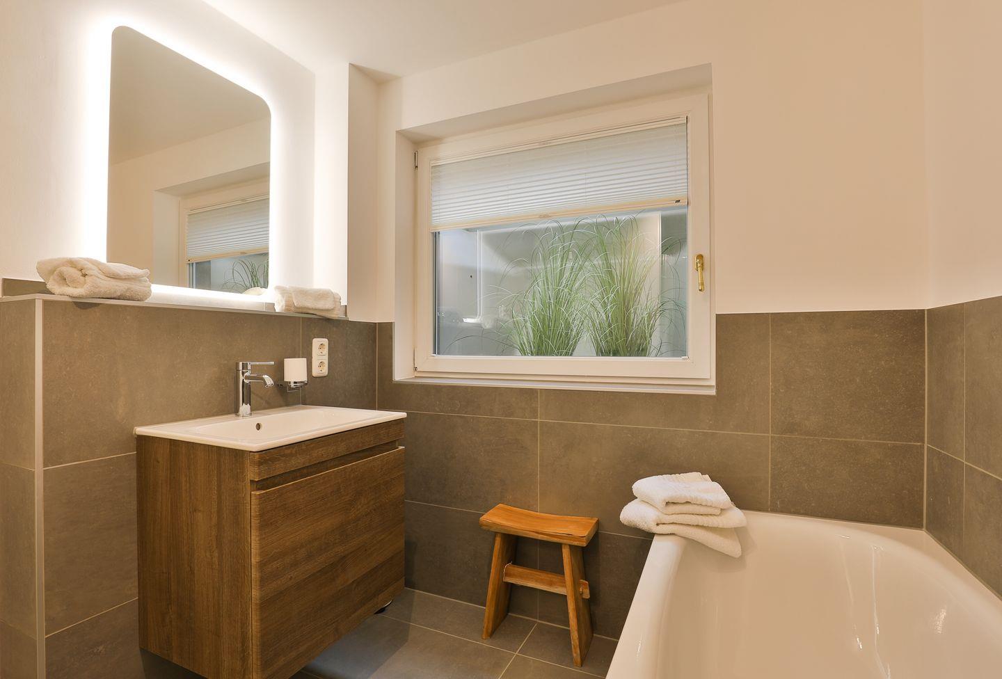 Badezimmer: Modern eingerichtetes Badezimmer mit Badewanne, Tageslichtschacht