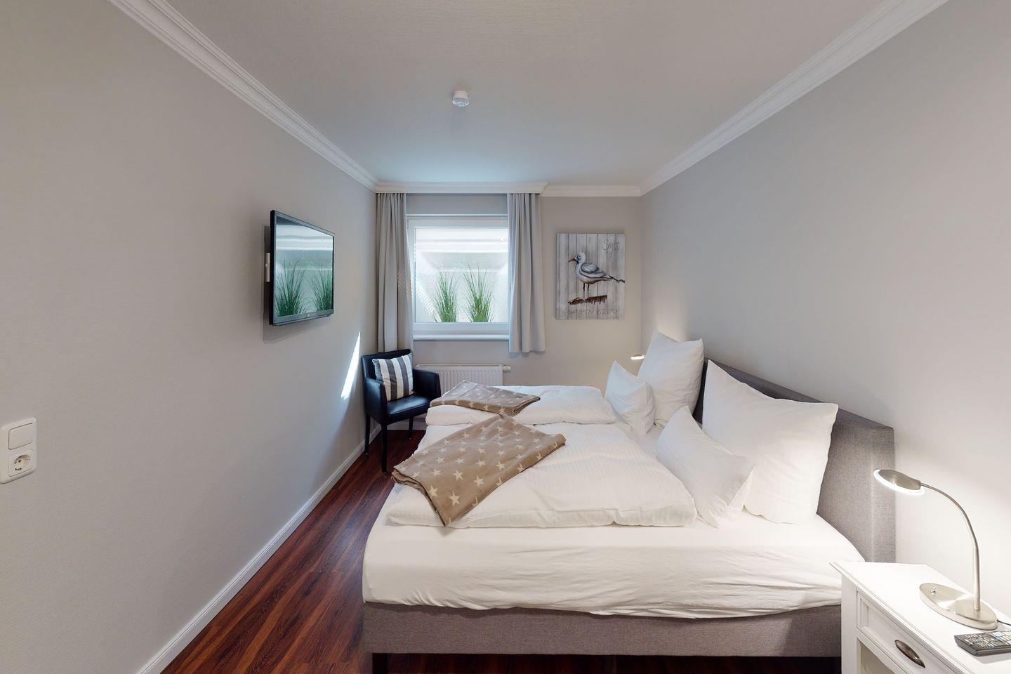 Schlafbereich mit TV und Tageslichtschacht.