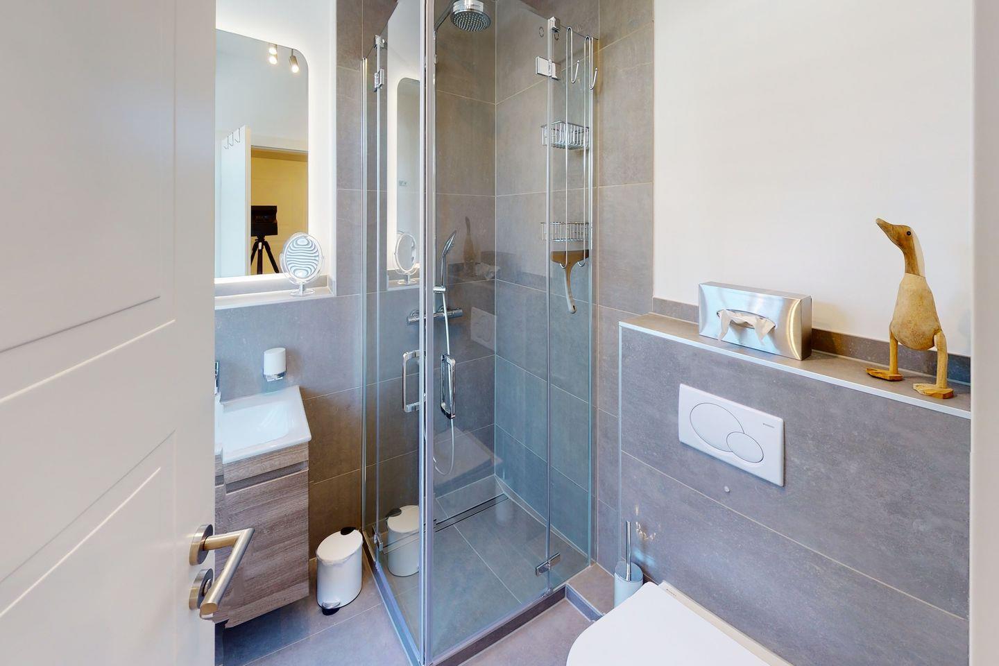 Badezimmer: Lichtdurchflutetes Badezimmer mit ebenerdiger Dusche und WC.