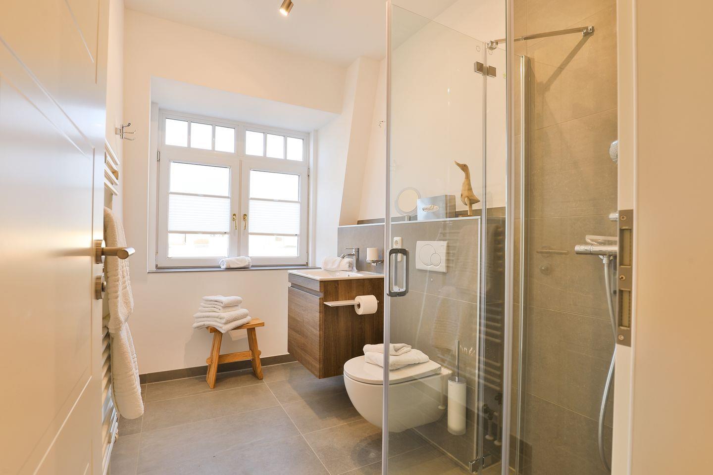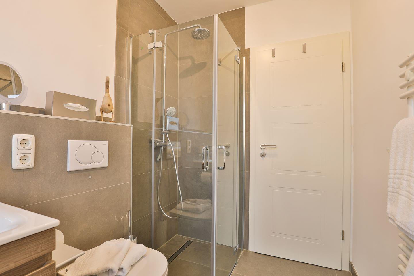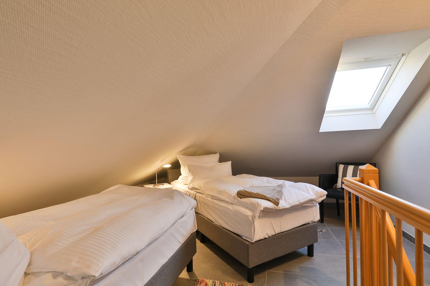 Das Badezimmer ist hell und verfügt über eine ebenerdige Dusche und ein WC. Im Schlafbereich gibt es ein gemütliches Doppelbett und einen Kleiderschrank. Über eine offene Treppe gelangen Sie vom Wohnbereich aus in das Dachgeschoss, wo sich ein weiterer Schlafbereich mit zwei Einzelbetten, einer Sitzgelegenheit und einem Kleiderschrank befindet.