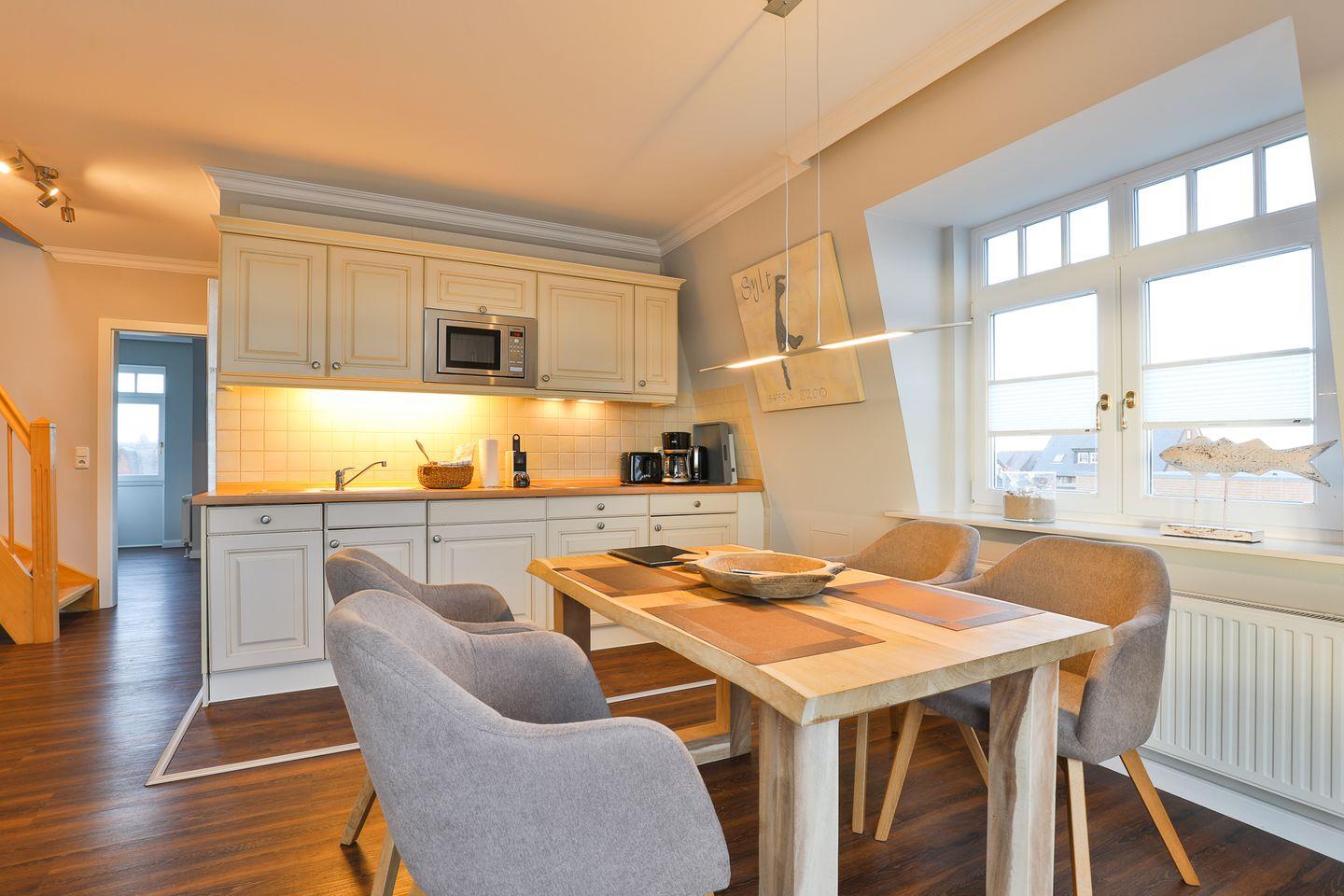 Die Ferienwohnung befindet sich in der 2. Etage und verfügt über einen lichtdurchfluteten Wohnbereich mit integrierter Essecke und einer gut ausgestatteten Küchenzeile im Landhausstil.