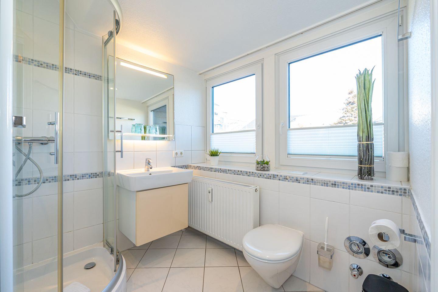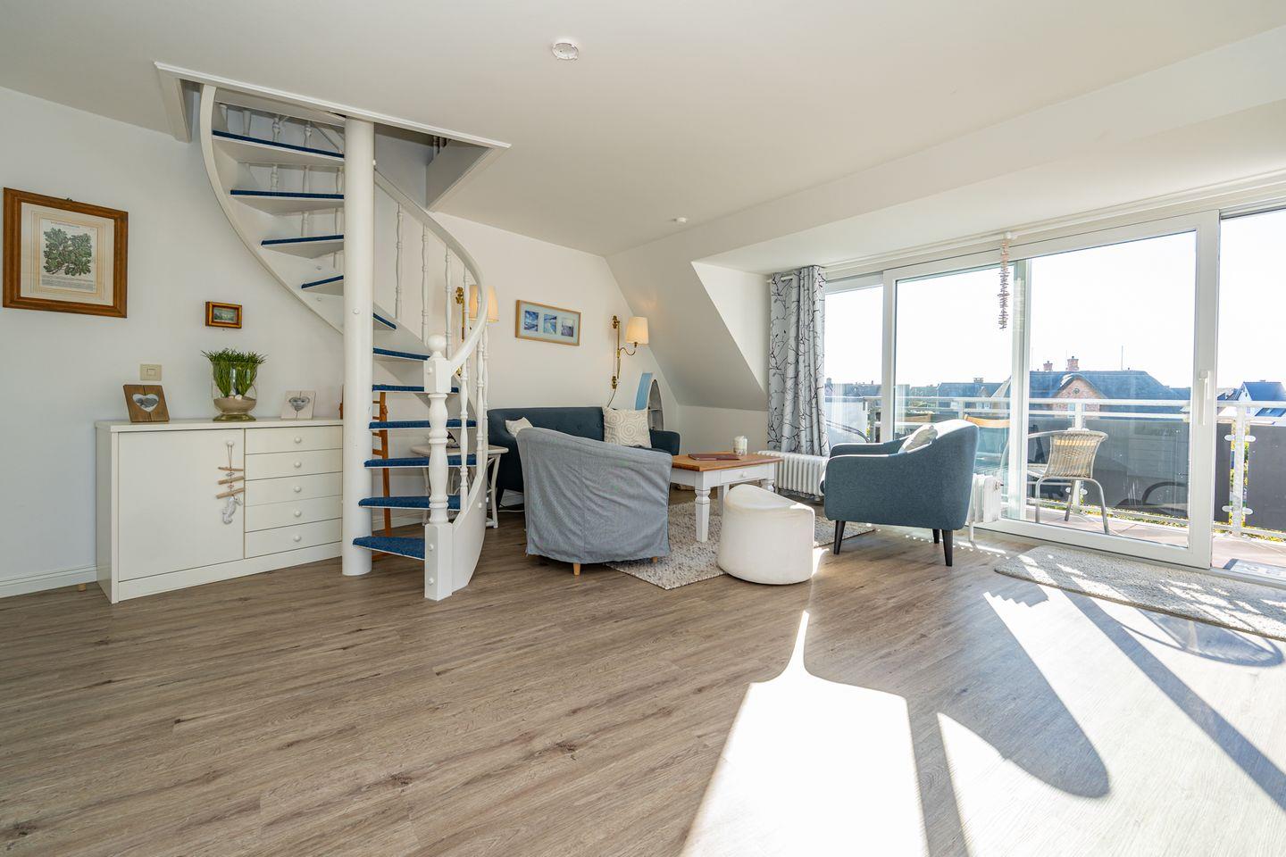 Im Obergeschoss befindet sich die Ferienwohnung Seepferdchen, die 2021 frisch renoviert wurde. Nach dem keinen Flur sind Sie im großen Wohn-Essbereich. Separat dazu finden Sie eine Einbauküche mit allen nötigen Geräten. Vor der Fensterfront ist der gemütliche Balkon mit Südlage. Der Esstisch befindet sich in der eleganten Wohnumgebung. Das Duschbad mit WC befindet sich ebenfalls auf dieser Ebene.