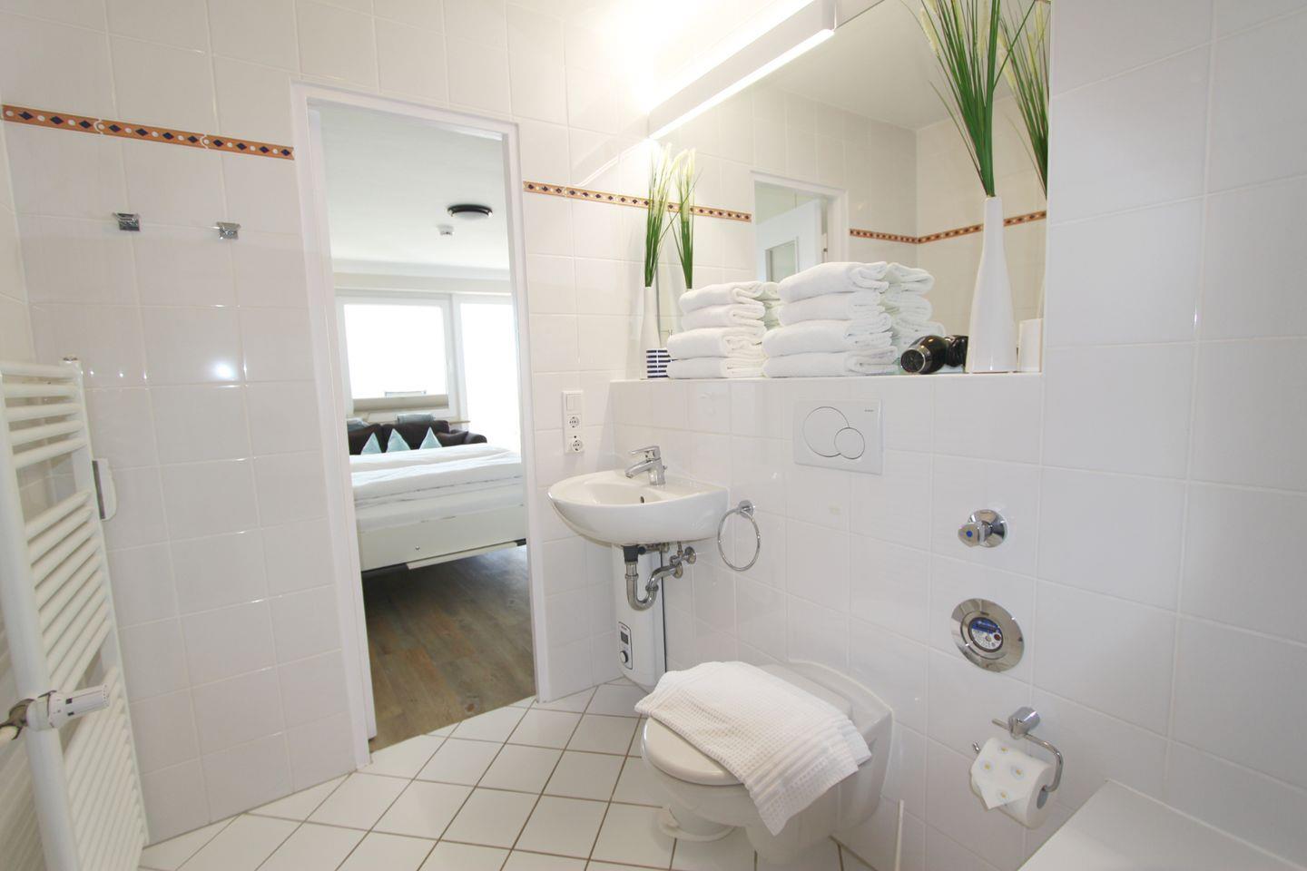 In dieser Ferienwohnung finden Sie ein hell gestaltetes Wannenbad mit WC vor. Darüber hinaus gibt es Waschmaschine und Trockner als Münzgeräte für die allgemeine Nutzung im Haus.