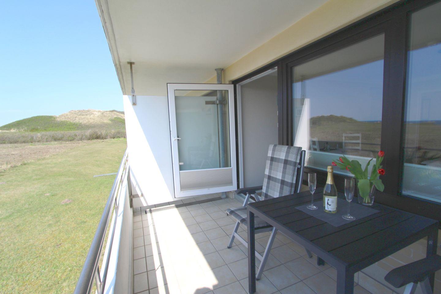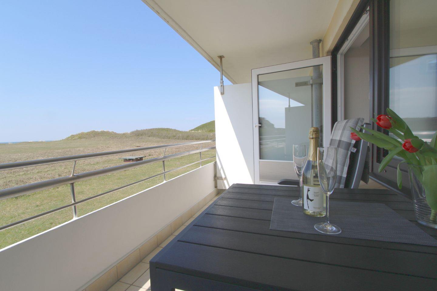 Durch die unmittelbare Strandnähe des Ferienkomplexes „Dünenhof zum Kronprinzen“ genießen Sie auf dem schönen West-Balkon einen traumhaften Meerblick der unvergessliche Sonnenuntergänge verspricht.
