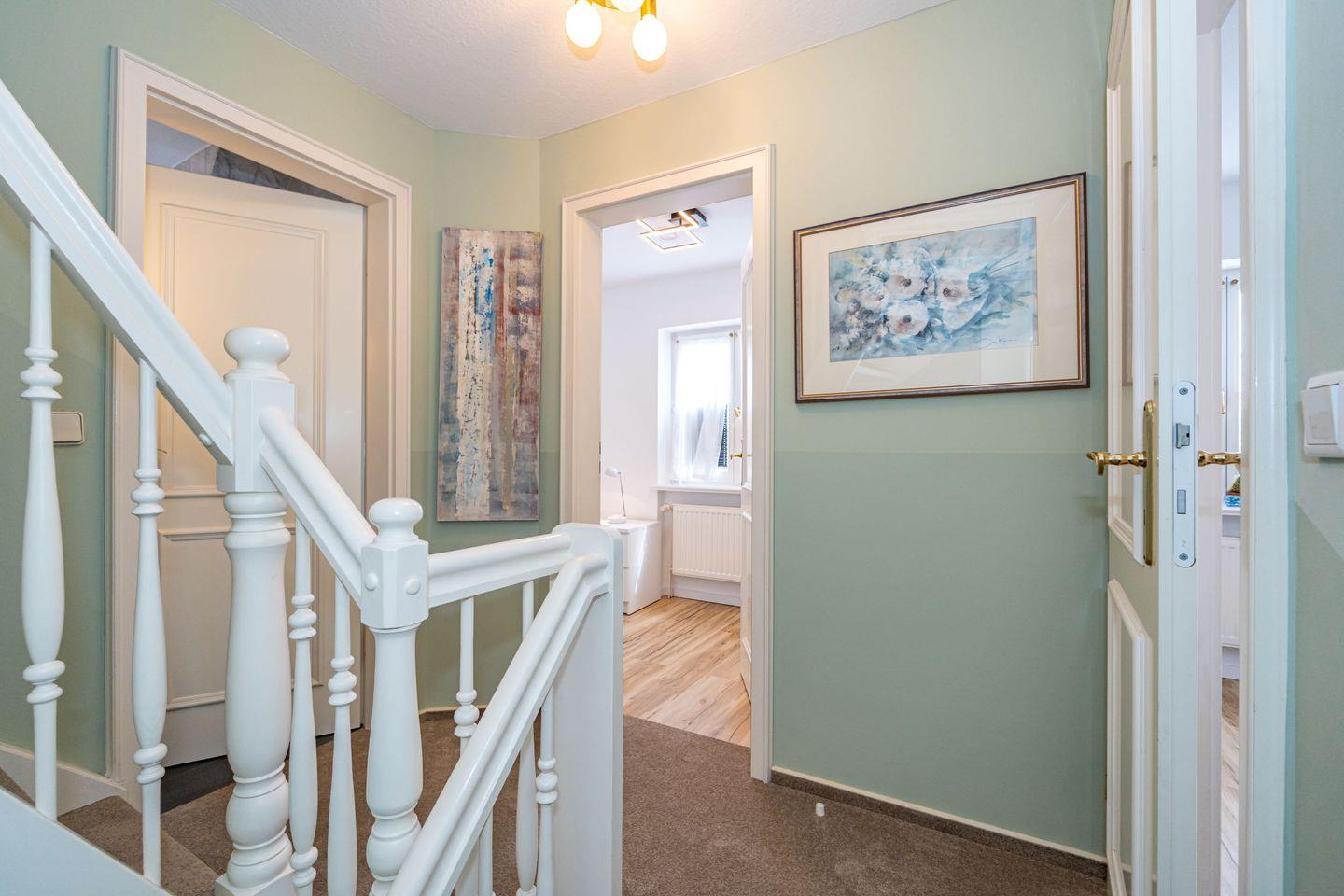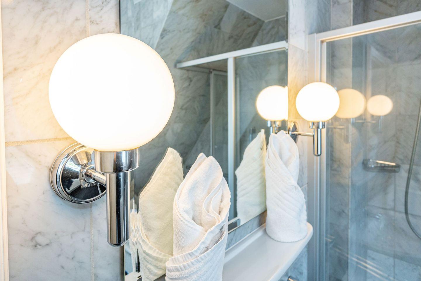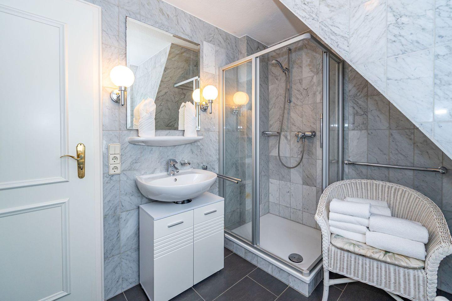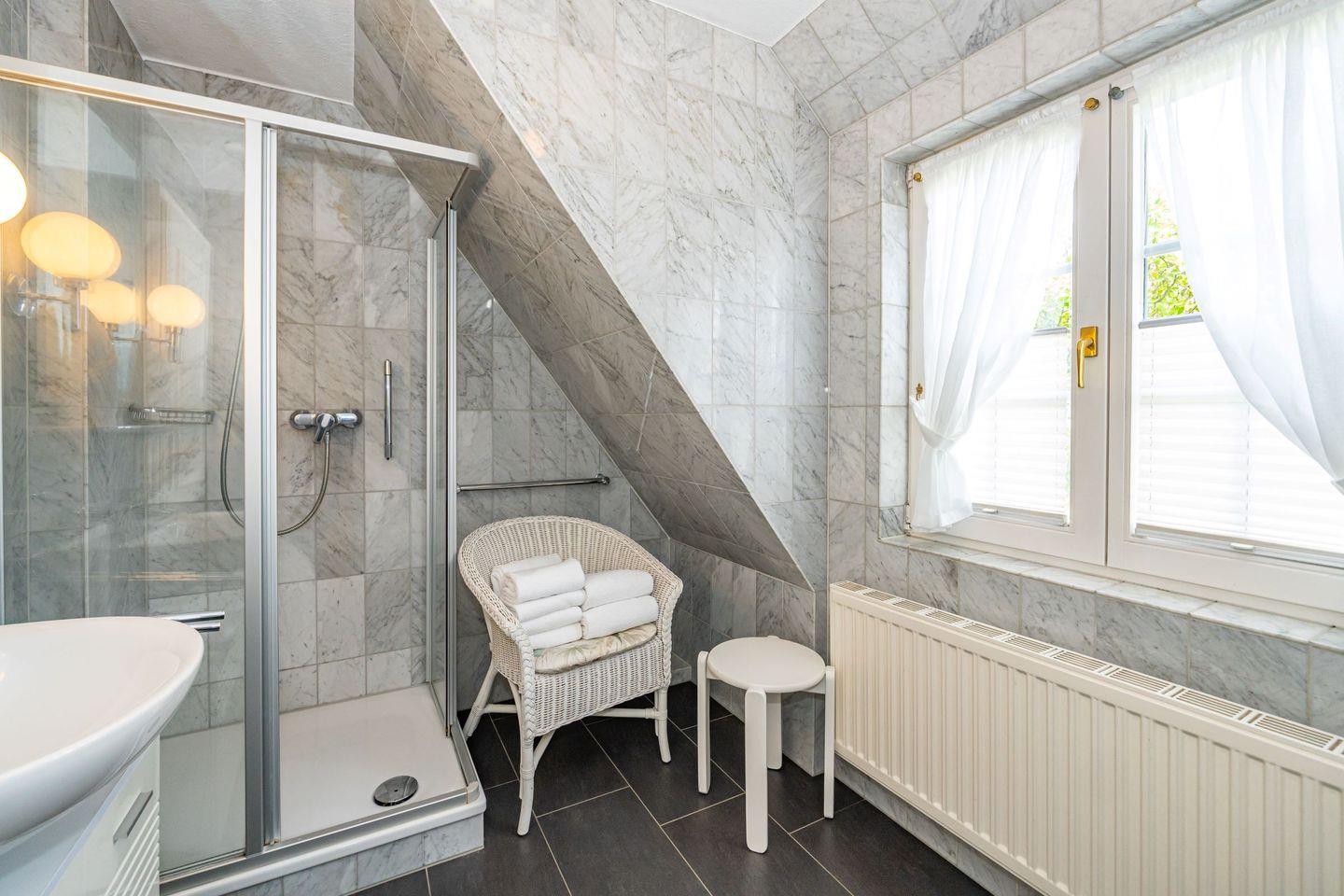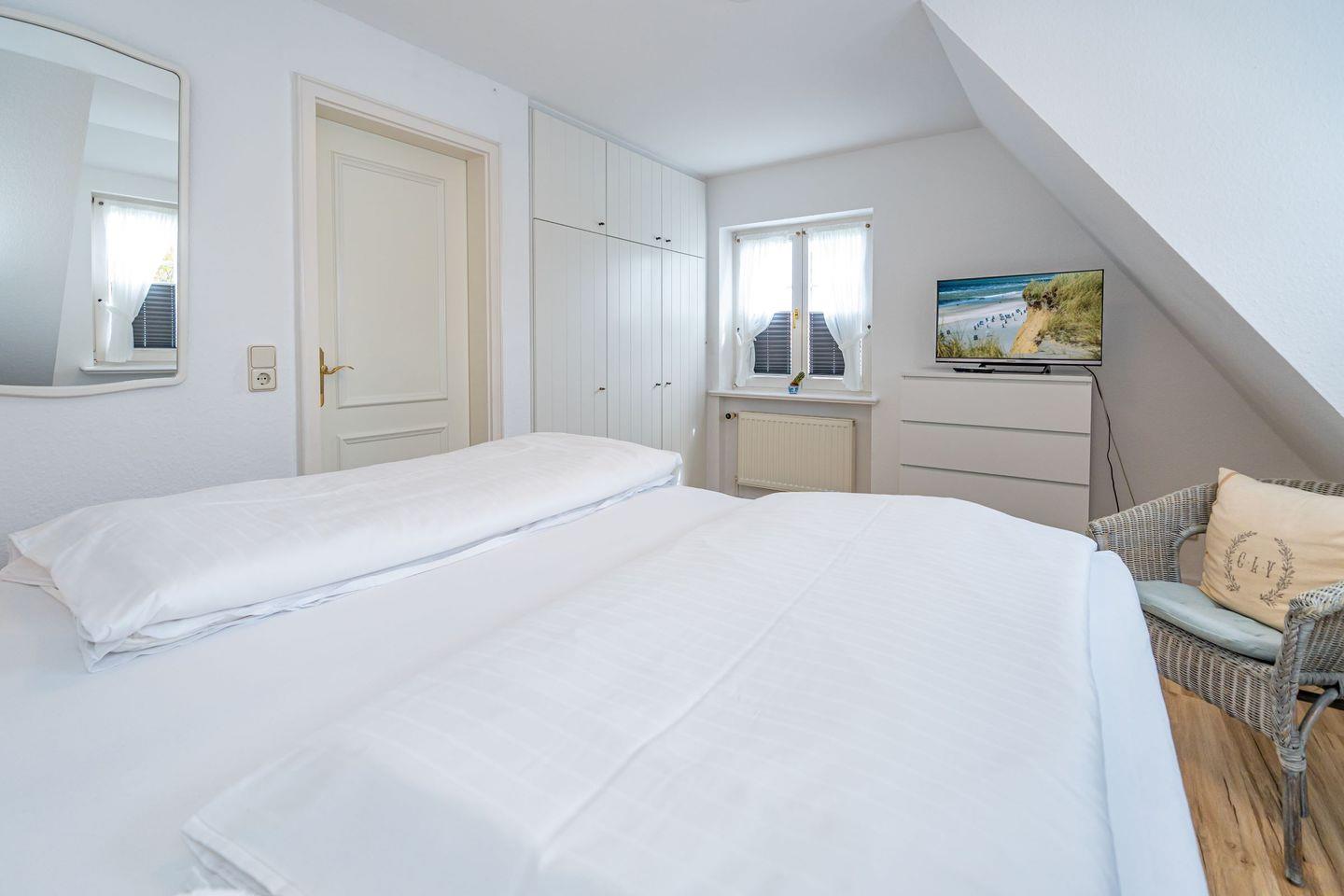 Das große Schlafzimmer hat ein Doppelbett (2 x 90 cm Breite), Einbauschänke sowie ein Kabel-Flachbild TV und Schreibtisch. Im kleineren Schlafzimmer ist ein Boxspringbett sowie ein Einbauschrank. Das Badezimmer mit Dusche, WC und Waschbecken hat Fußbodenheizung.