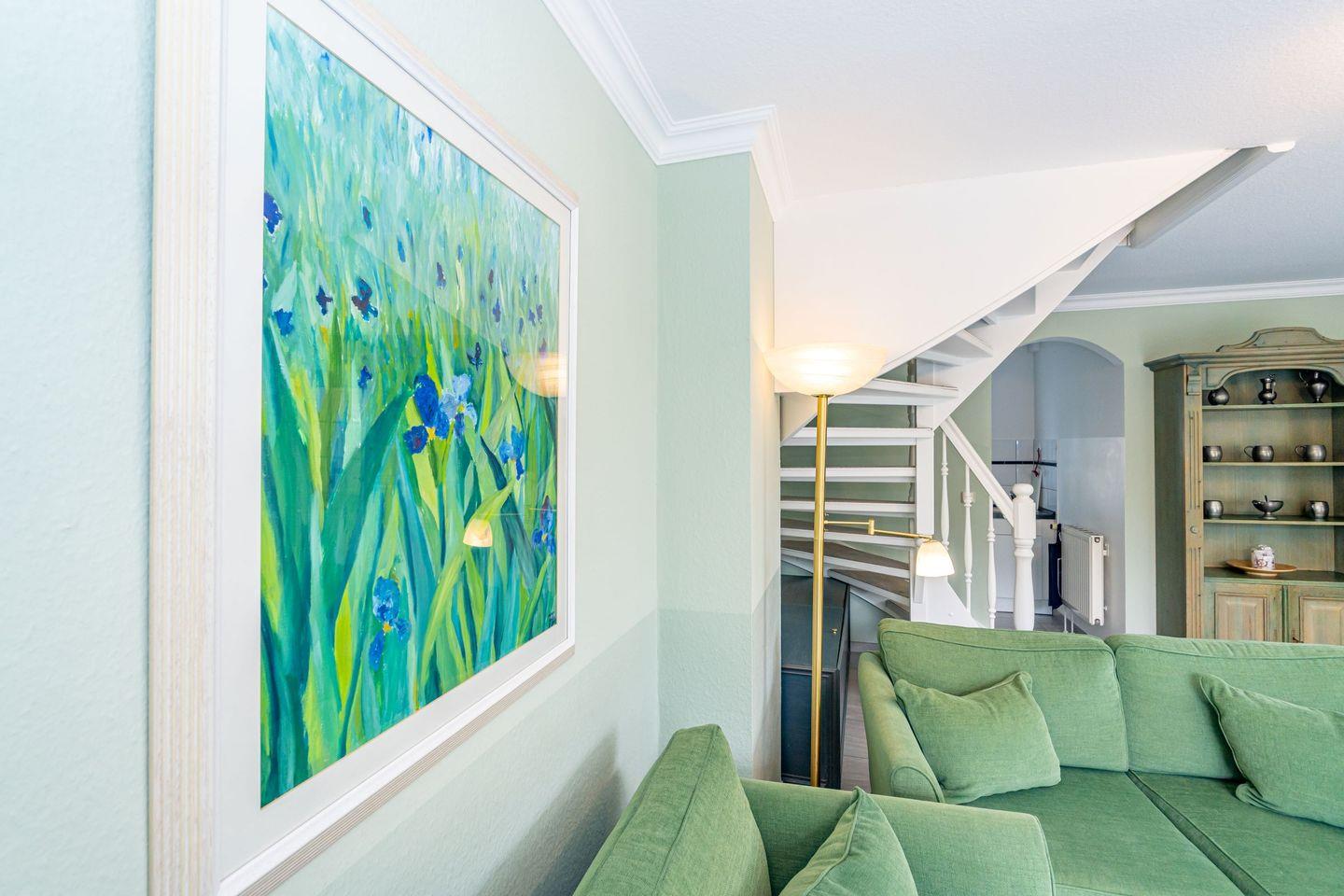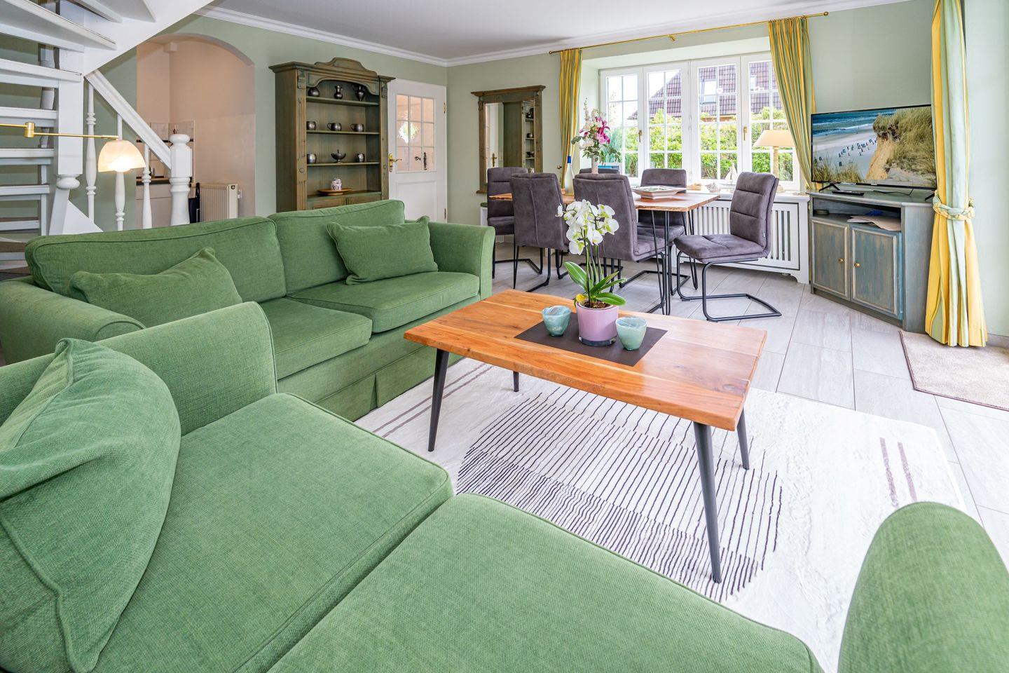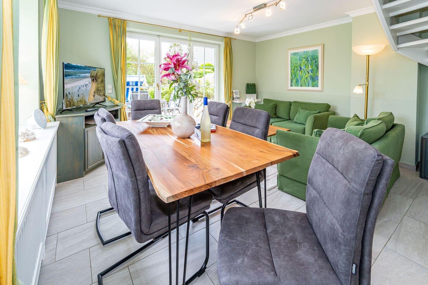 Im Erdgeschoss erreichen Sie durch einen Windfang einen geschmackvoll eingerichteten Wohn-Essraum, das Herzstück der Wohnung, mit Sofaecke und großem Esstisch für 6 Personen. Außerdem verfügt die Unterkunft über Fußbodenheizung, Kabel-Flachbild TV, DVD Player, Radio, Telefon sowie WLAN. Eine separate Küche mit Ceranfeld, Geschirrspüler, Backofen, Mikrowelle und Kühlschrank ist vorhanden. Ein Gäste WC im Erdgeschoss, ein Duschbad im 1OG und eine Toilette im 2. OG sind vorhanden.