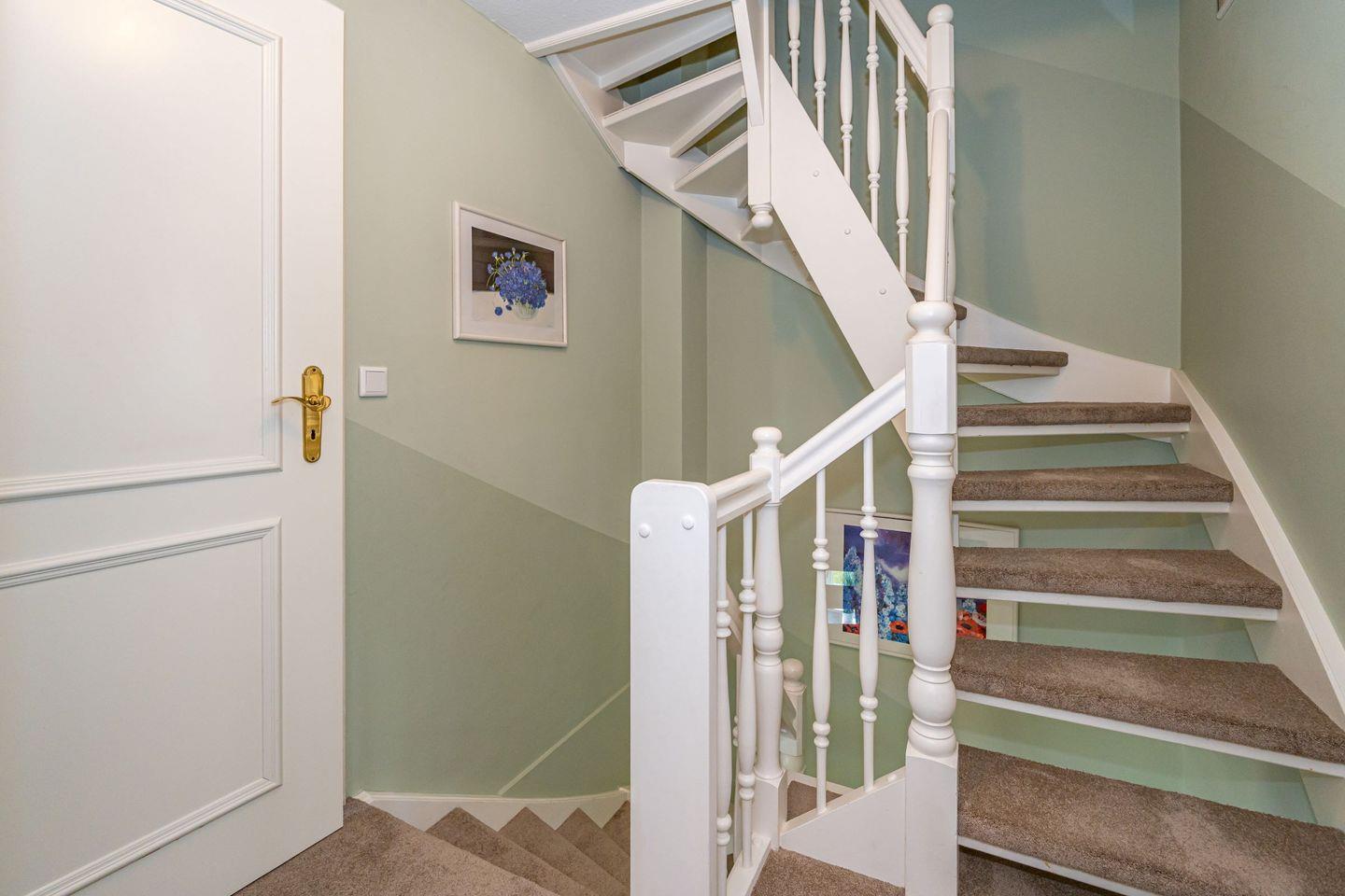 Eine nordisch weiße Holztreppe führt in das Obergeschoss,