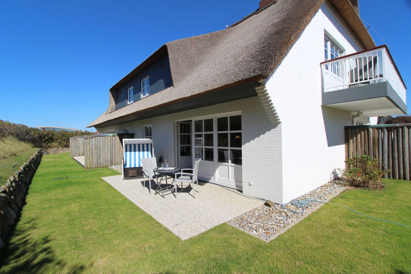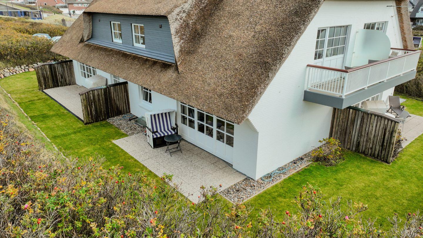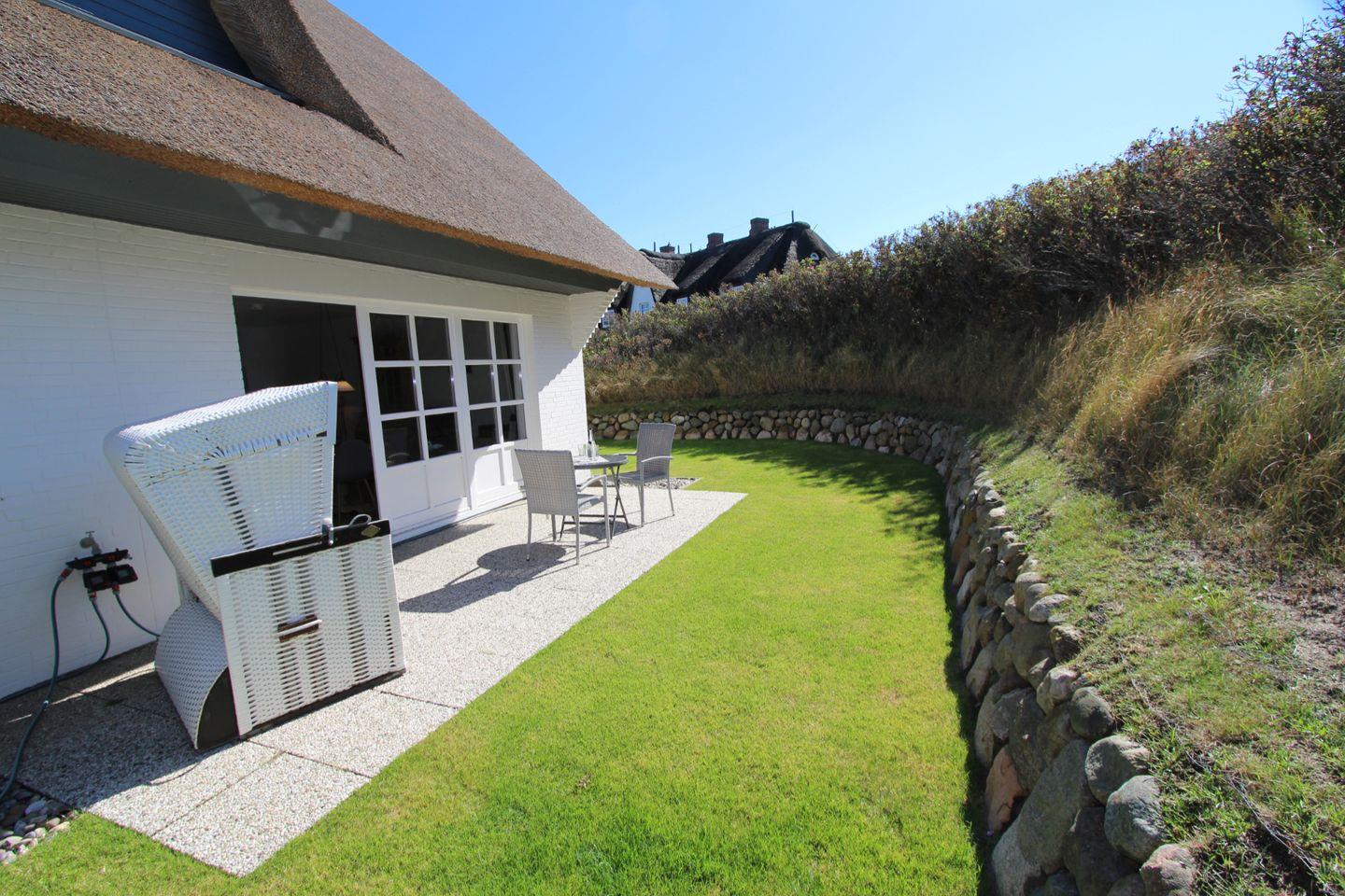 Auf der großen West-Terrasse mit Blick über die Dünen und andere Reetdach-Häuser können Sie sich ausgiebig erholen und Ihre Zeit auf Sylt wunderbar genießen.