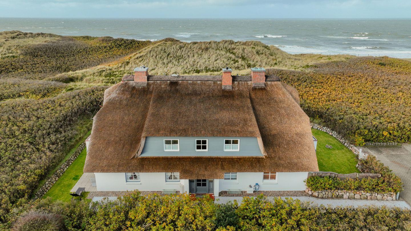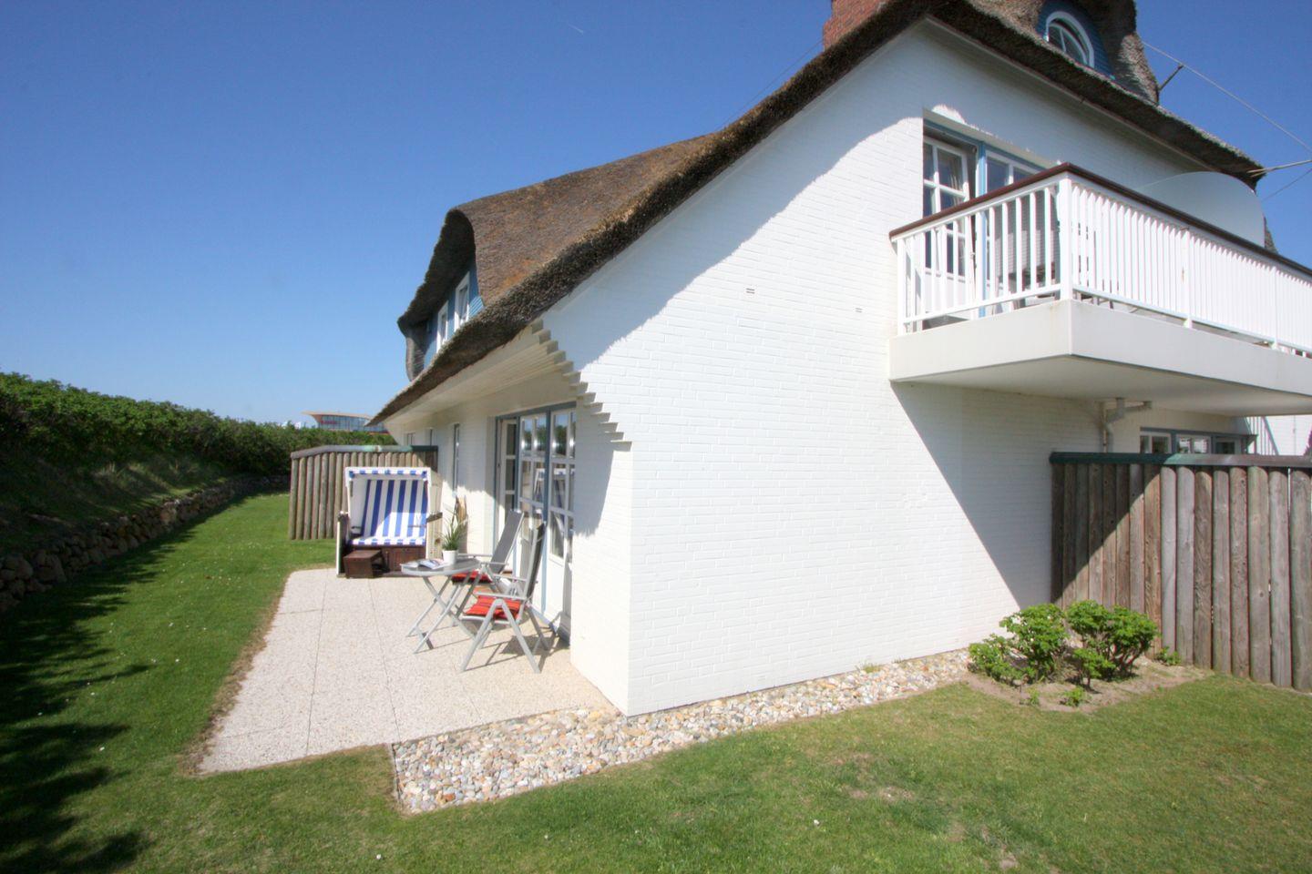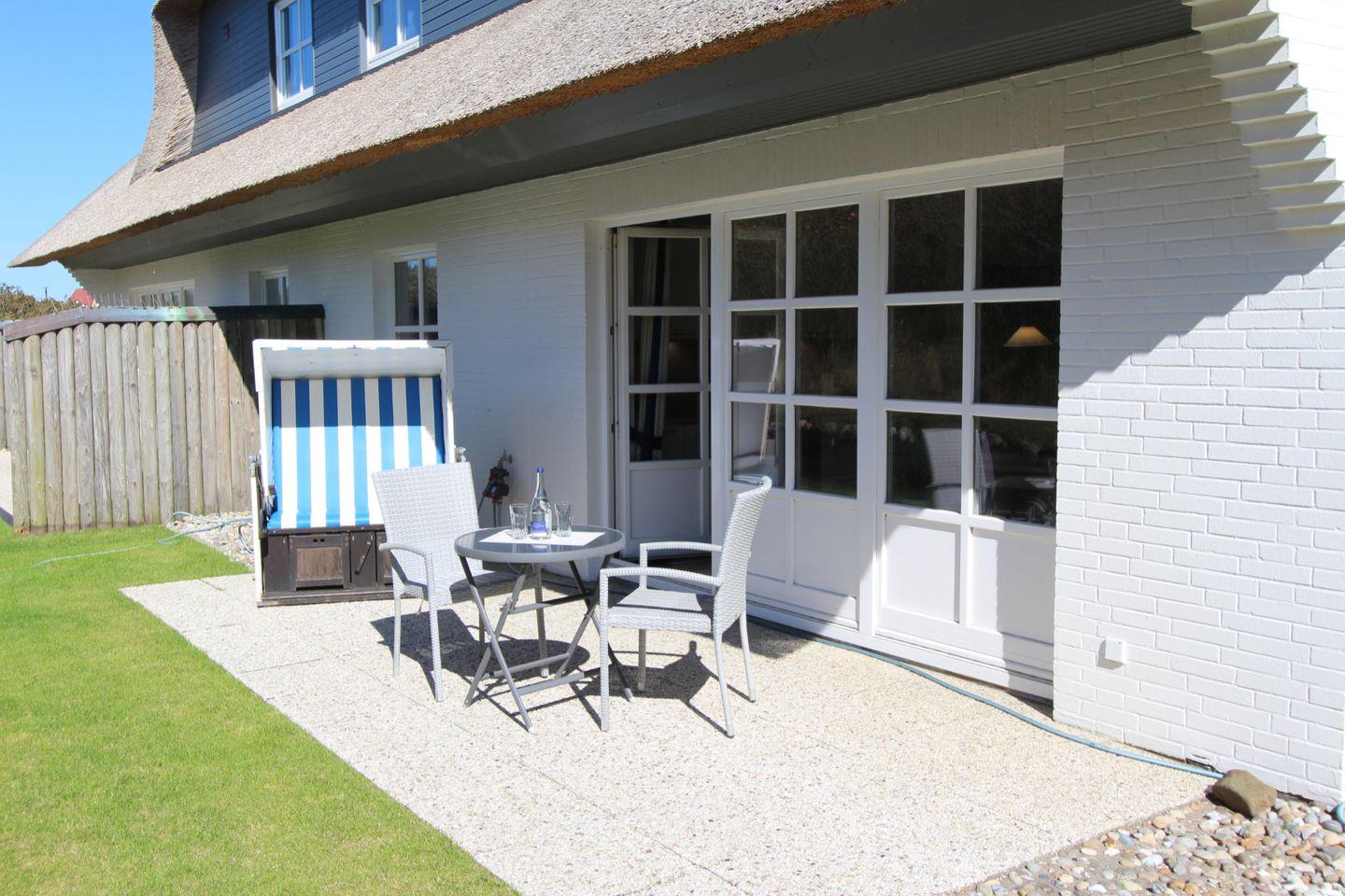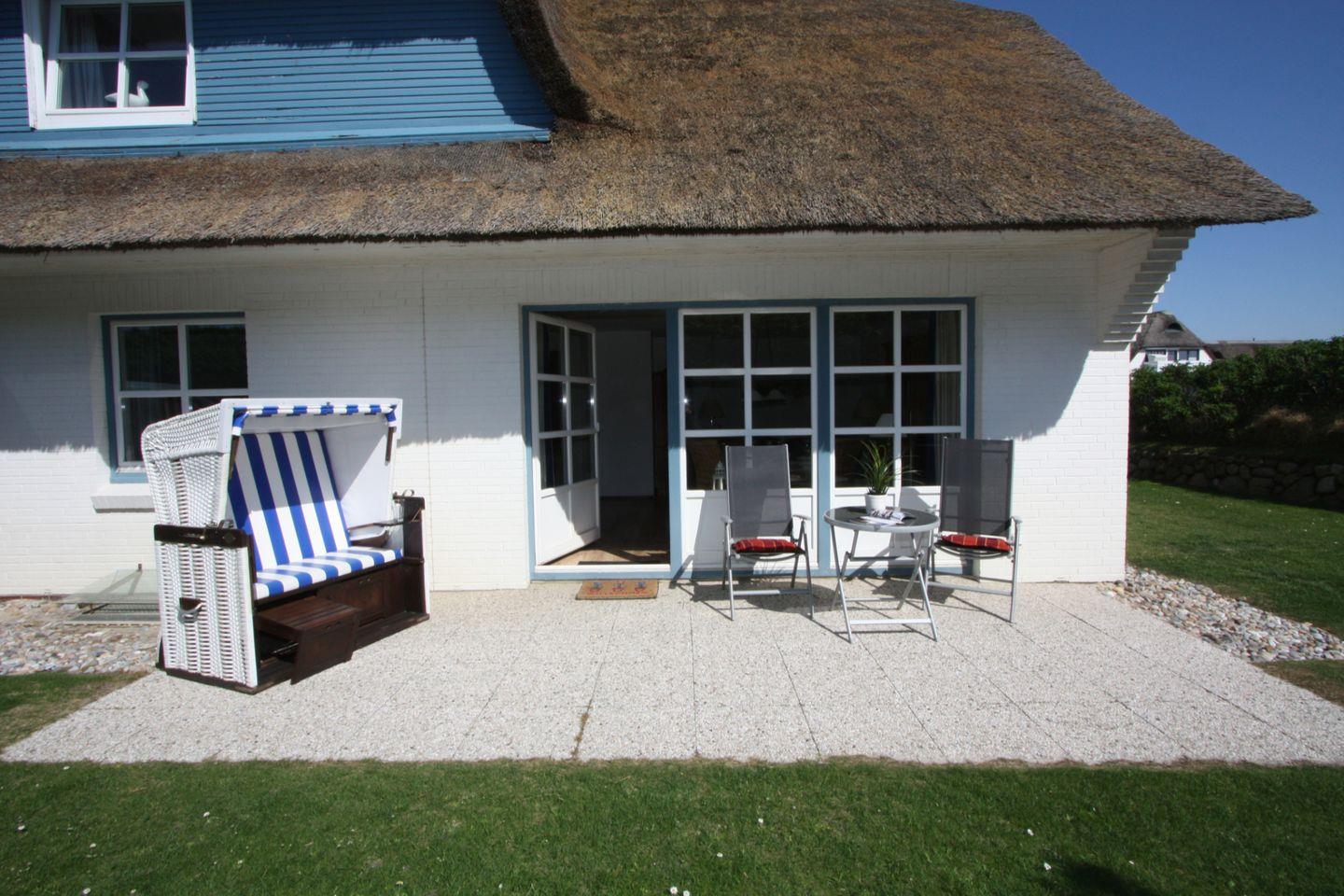 Auf der großen West-Terrasse mit Blick über die Dünen und andere Reetdach-Häuser können Sie sich ausgiebig erholen und Ihre Zeit auf Sylt wunderbar genießen.