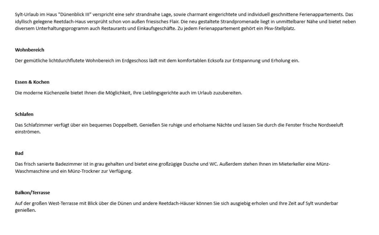 Sylt-Urlaub im Haus "Dünenblick III" verspricht eine sehr strandnahe Lage, sowie charmant eingerichtete und individuell geschnittene Ferienappartements. Das idyllisch gelegene Reetdach-Haus versprüht schon von außen friesisches Flair. Die neu gestaltete Strandpromenade liegt in unmittelbarer Nähe und bietet neben diversem Unterhaltungsprogramm auch Restaurants und Einkaufsgeschäfte. Zu jedem Ferienappartement gehört ein Pkw-Stellplatz.