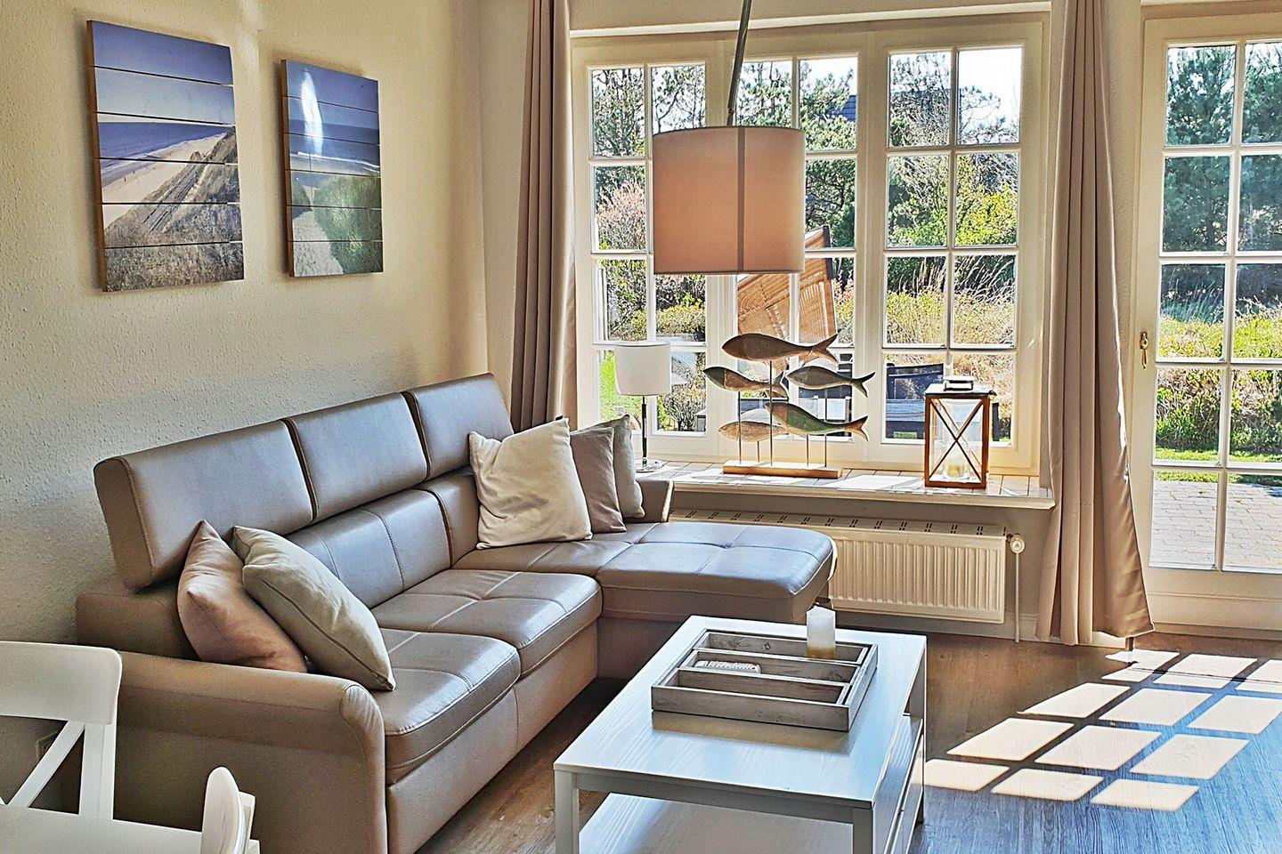 Der Wohnbereich lädt mit einem großzügigen Sofa und einem großen Flachbildfernseher zum Entspannen ein – perfekt, um einen erlebnisreichen Tag auf Sylt gemütlich ausklingen zu lassen. Die separate Küche ist funktional ausgestattet und bietet alles, was Sie für die Zubereitung Ihrer Mahlzeiten benötigen.