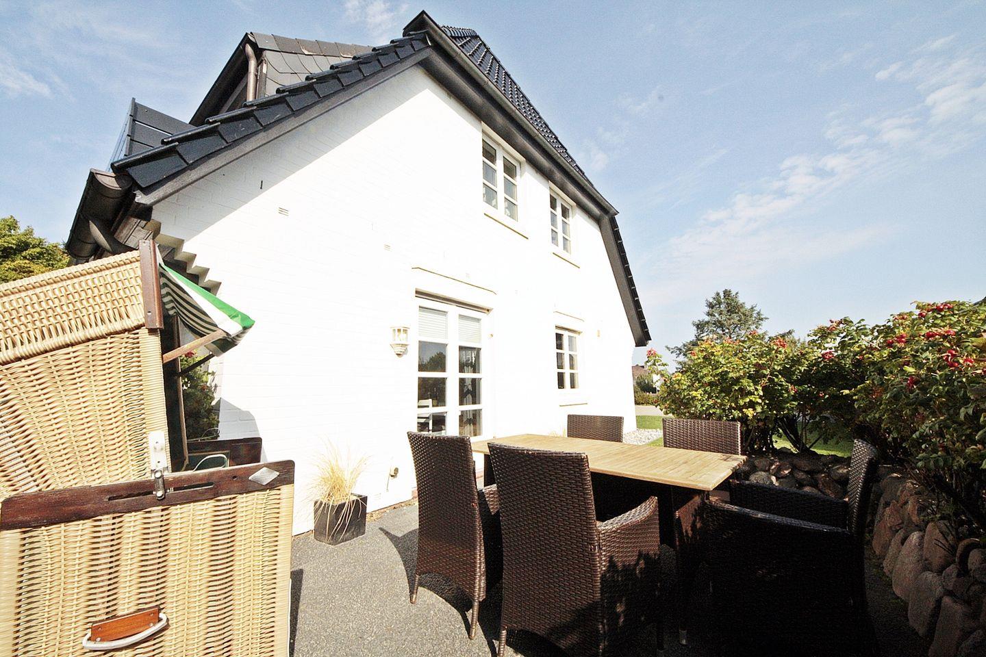 Ein besonderes Highlight ist die möblierte Terrasse mit Strandkorb. Hier können Sie die frische Nordseeluft genießen, den Tag mit einer Tasse Kaffee beginnen oder den Abend entspannt im Freien ausklingen lassen – ein idealer Ort, um die ruhige Umgebung auf sich wirken zu lassen.