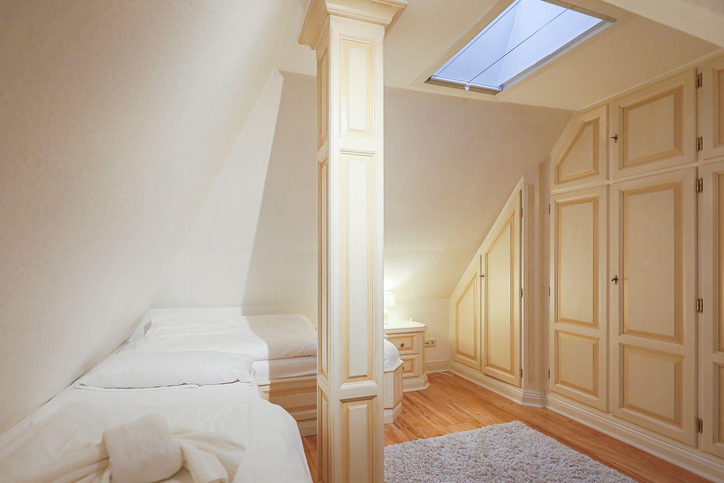Noch uriger ist nur das Dachgeschoss, das über eine schmale Treppe zu erreichen ist. Zwei Einzelbetten und ein kleiner Loungebreich mit TV sind hier nicht nur für Kinder das Größte.