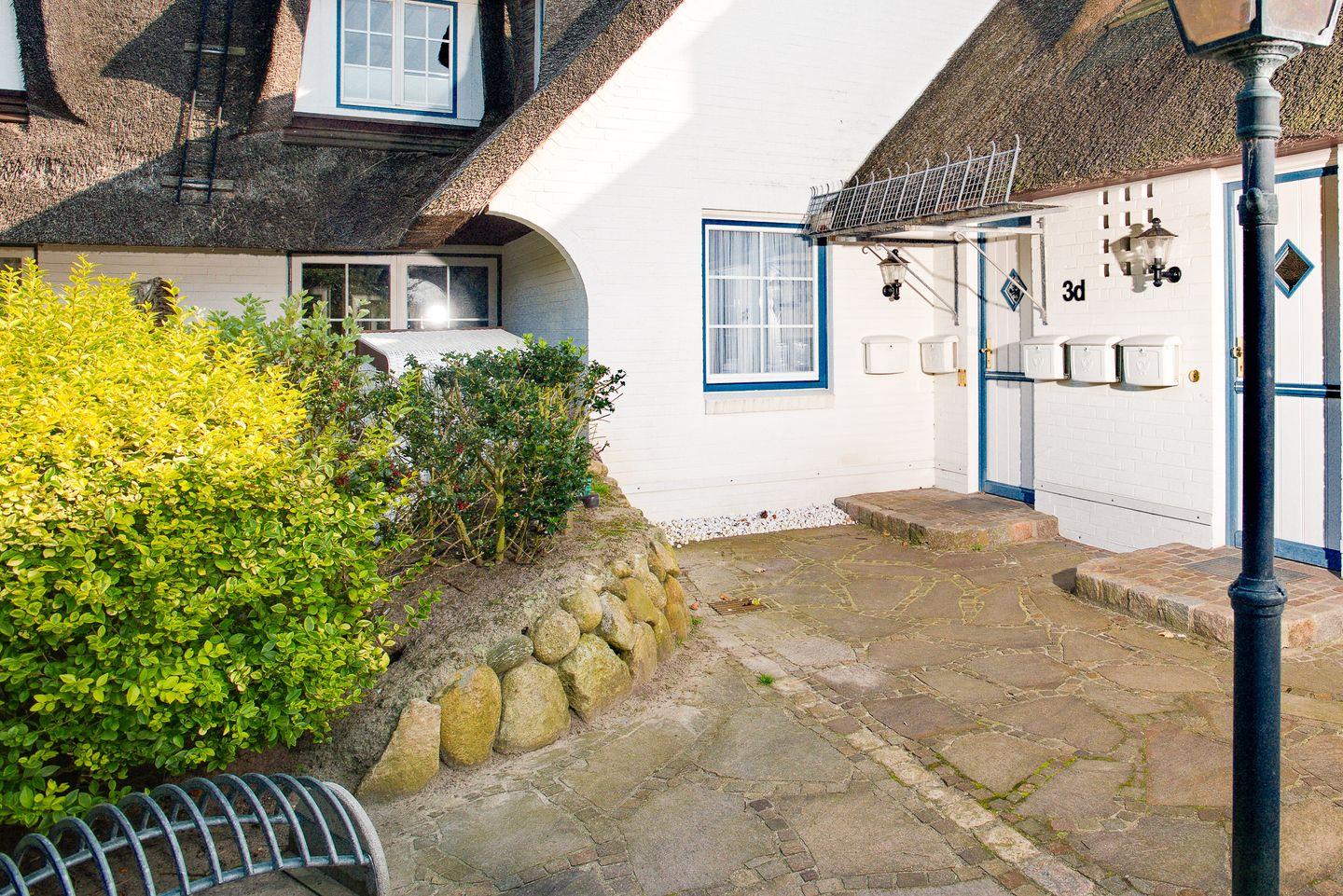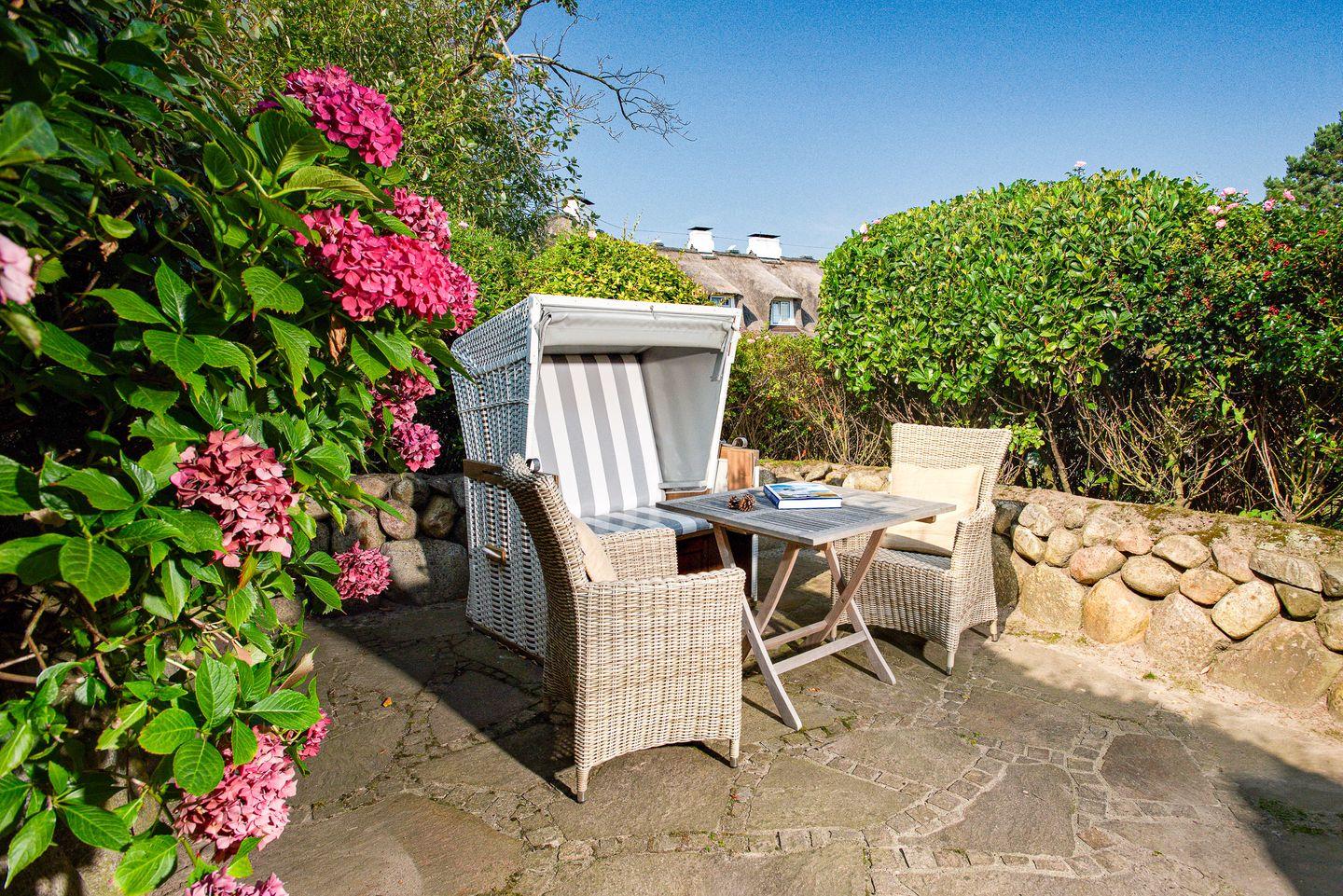 Zum Lisbeth Hus gehört eine sogenannte "Sonnenkuhle", also eine kleine Gartenterrasse inmitten der Anlage, die mit Strandkorb und Stühlen ausgestattet ist.