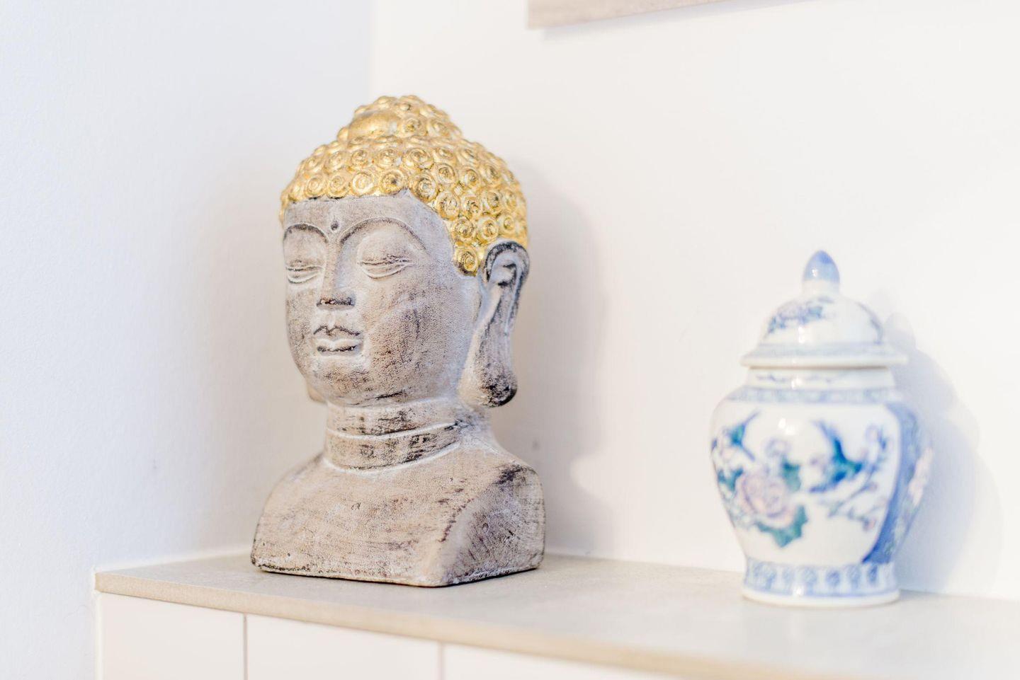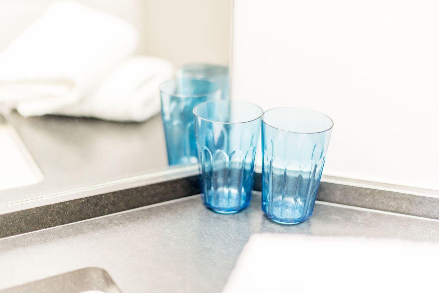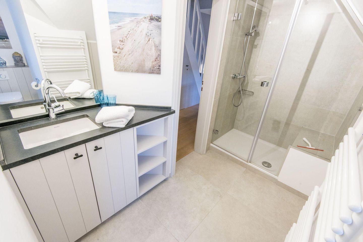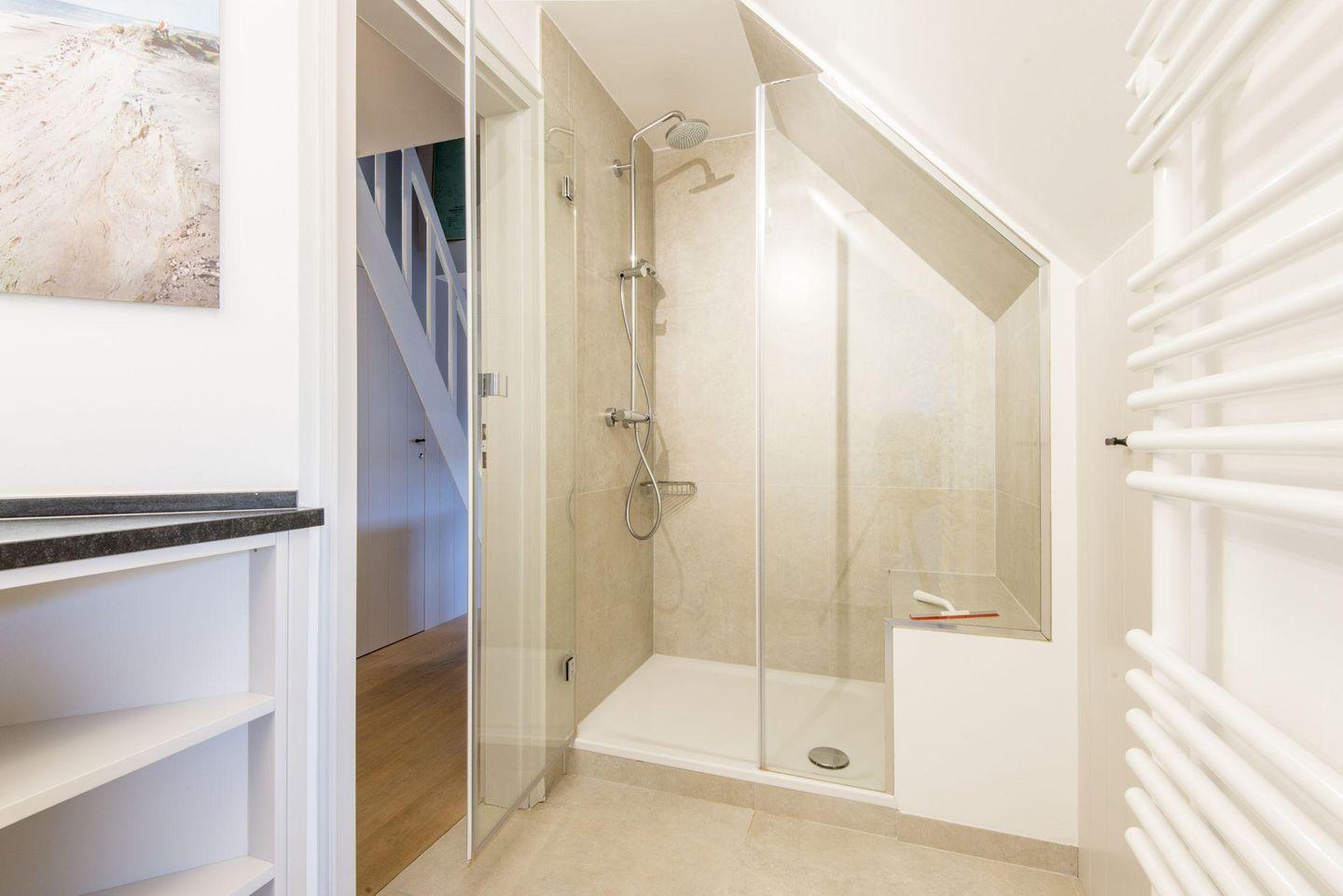 Das moderne Badezimmer verfügt über eine ebenerdige Dusche, WC, Handtuchwärmer, Föhn und Tageslicht. Der gemeinschaftliche Wellnessbereich des Hauses bietet eine Sauna und einen Ruheraum für entspannte Stunden.