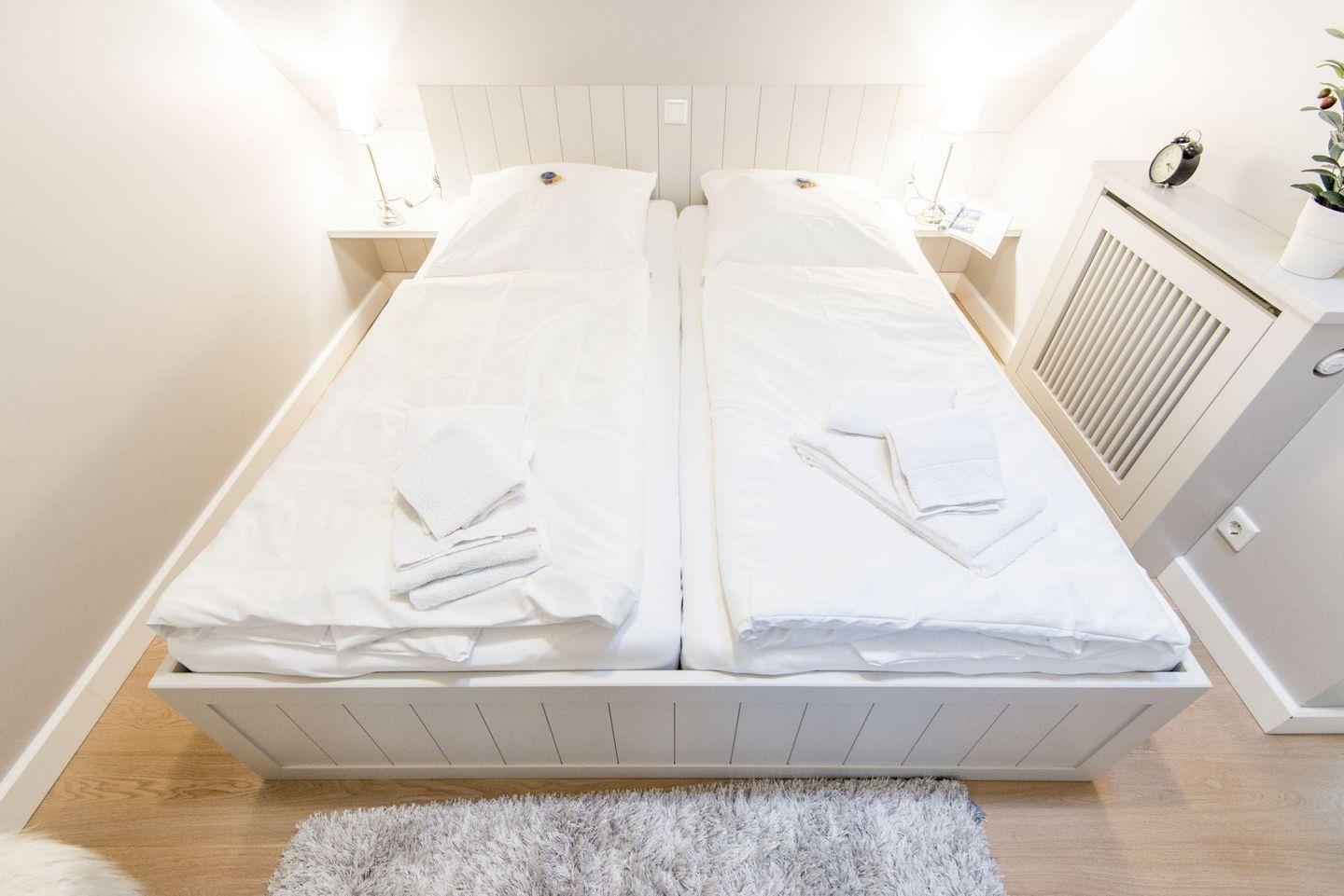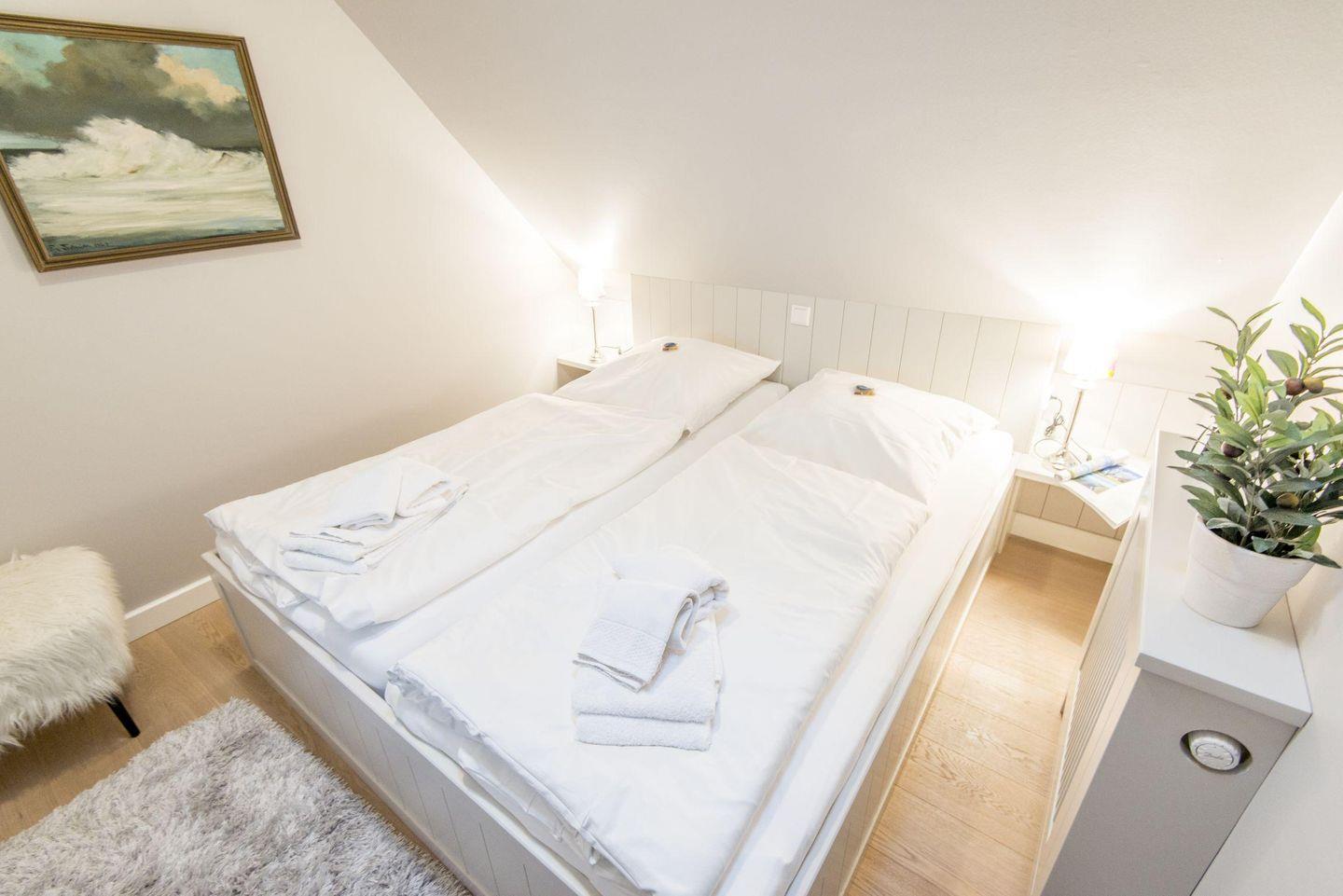 Das Schlafzimmer im Dachgeschoss bietet ein komfortables Doppelbett (2 x 90x200 cm), einen Einbauschrank und TV und sorgt für erholsame Nächte.