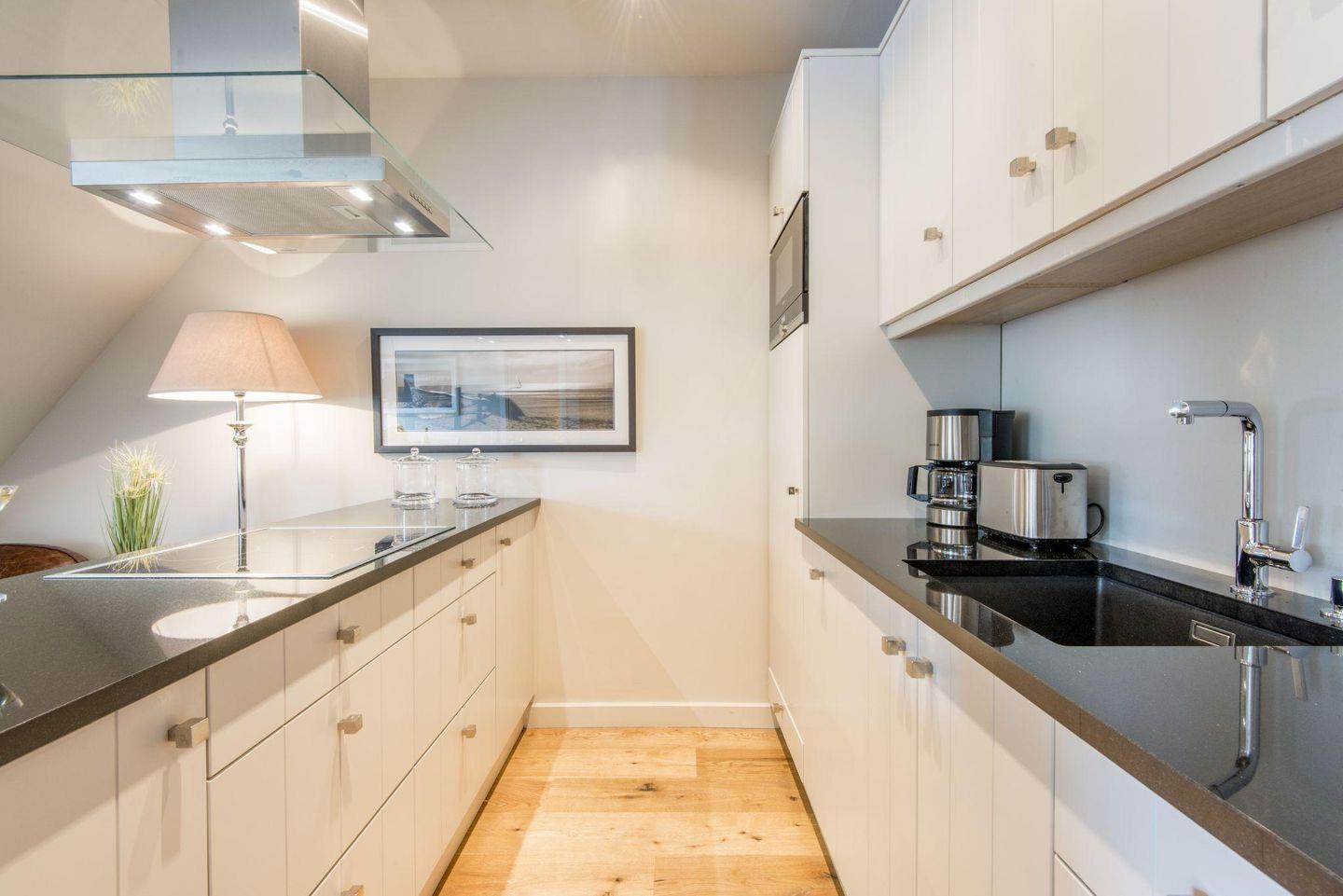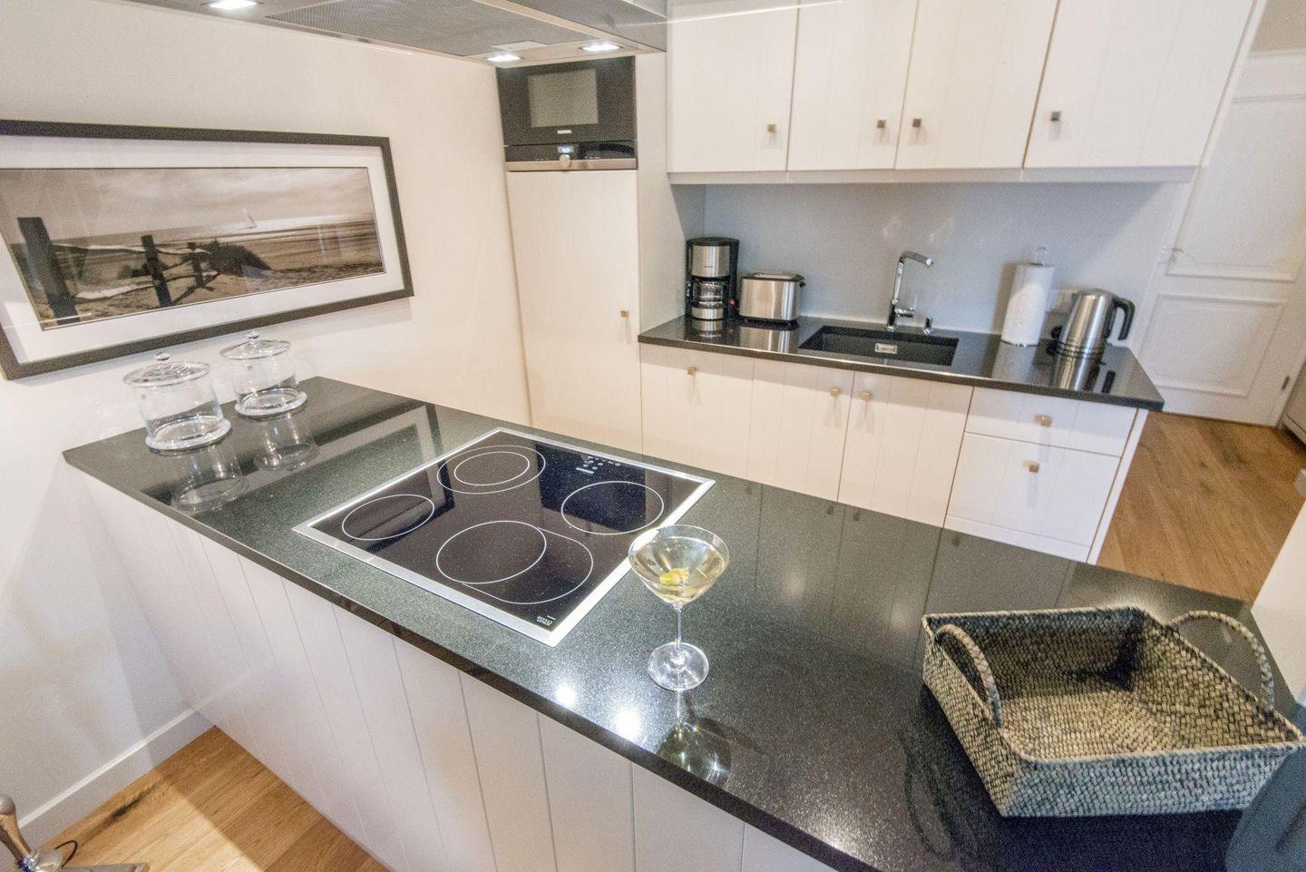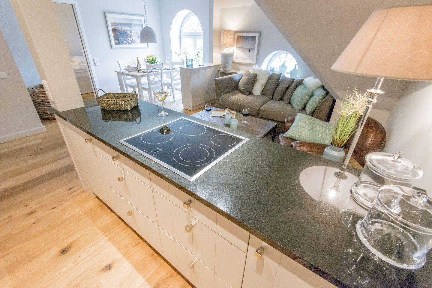 Die offene Küche ist mit einem Cerankochfeld, Mikrowelle, Geschirrspüler und Filterkaffeemaschine ausgestattet und bietet alles, was Sie für die Zubereitung Ihrer Lieblingsspeisen benötigen.