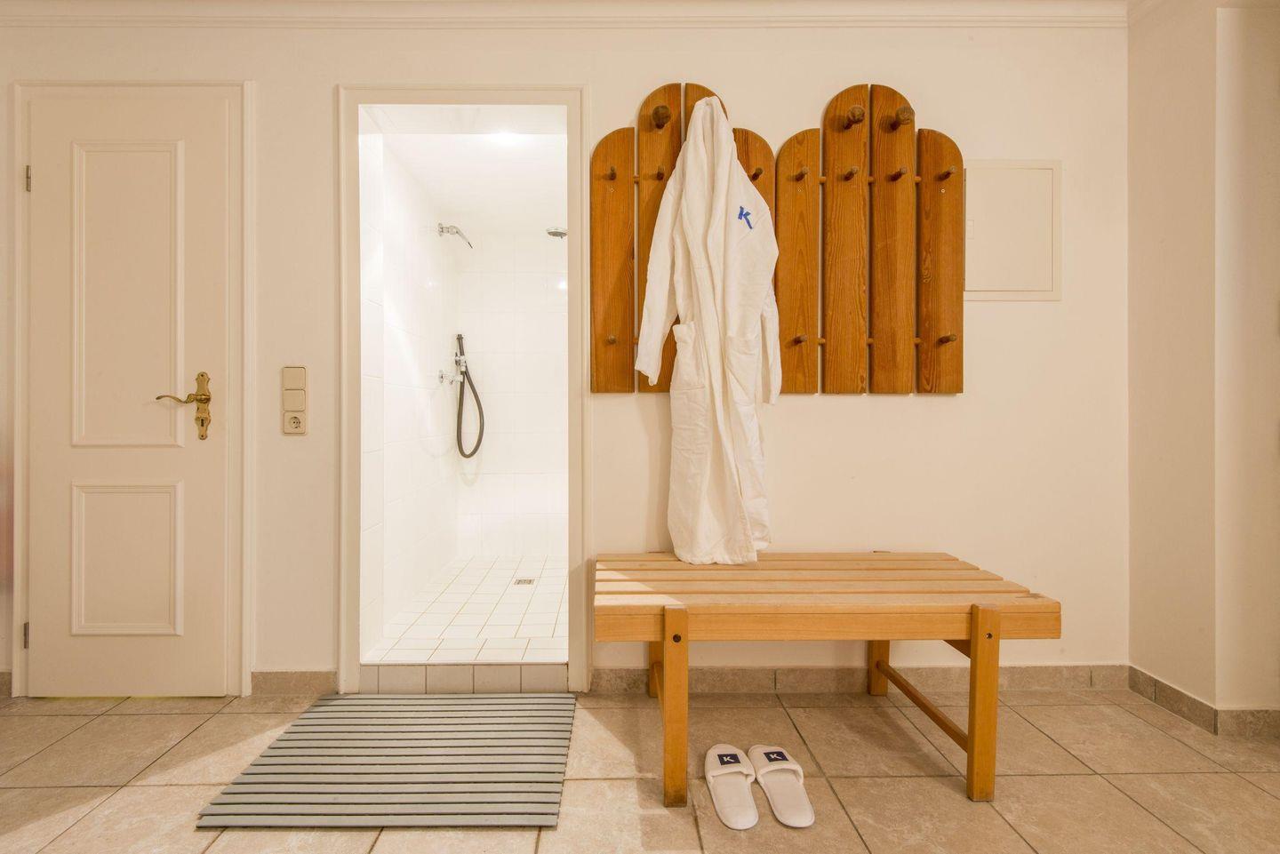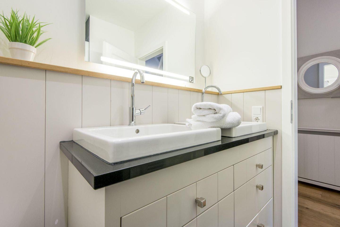 Das moderne Badezimmer ist mit einer Dusche, WC, Doppelwaschbecken, Handtuchwärmer und Föhn ausgestattet und bietet den perfekten Start in den Tag. Im gemeinschaftlichen Wellnessbereich mit Sauna und Ruheraum im Haus können Sie nach einem Strandtag wunderbar entspannen.