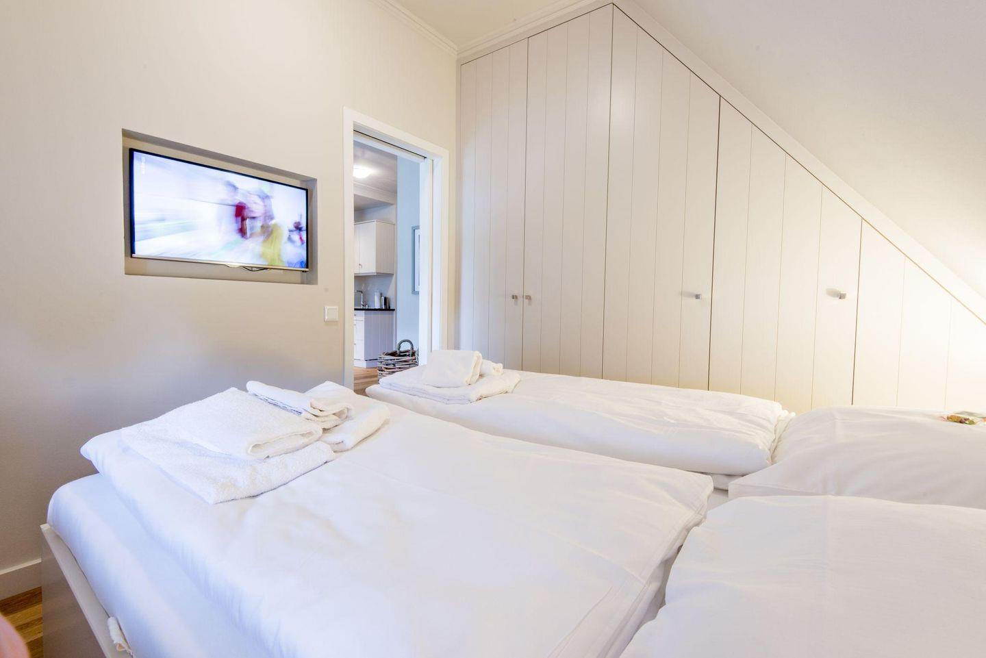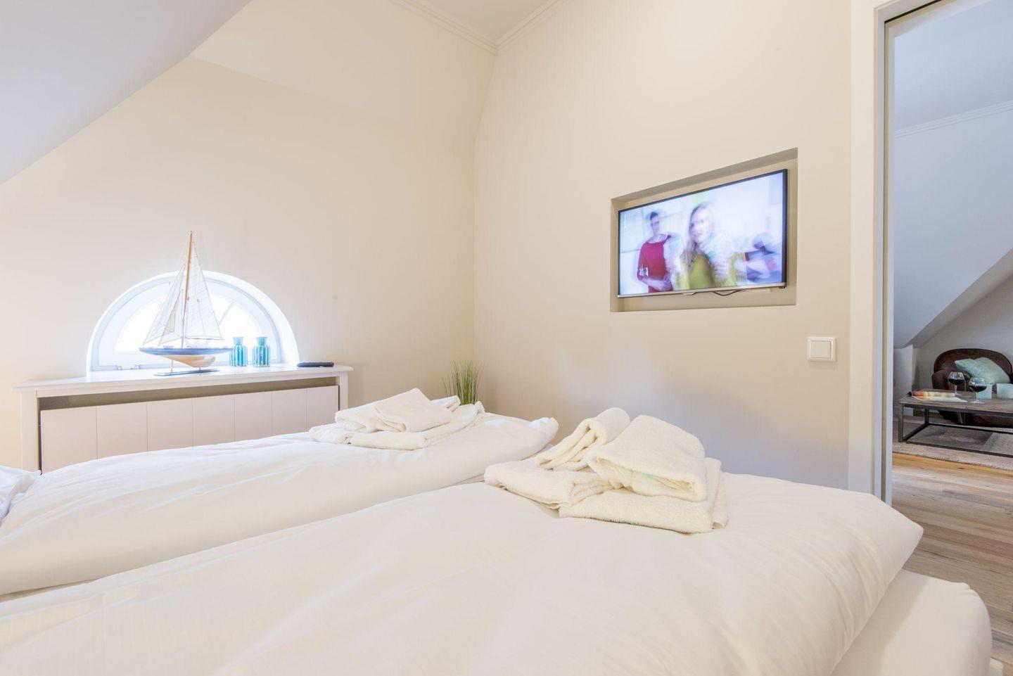 Im Obergeschoss befinden sich zwei stilvoll eingerichtete Schlafzimmer, die für erholsame Nächte sorgen. Das erste Schlafzimmer ist mit einem komfortablen Doppelbett (2 x 80x200 cm), einem geräumigen Einbauschrank und einem TV ausgestattet – ideal für entspannte Stunden und ungestörten Schlaf. Das zweite Schlafzimmer bietet ebenfalls ein bequemes Doppelbett (2 x 80x200 cm) und einen Einbauschrank sowie einen eigenen TV.