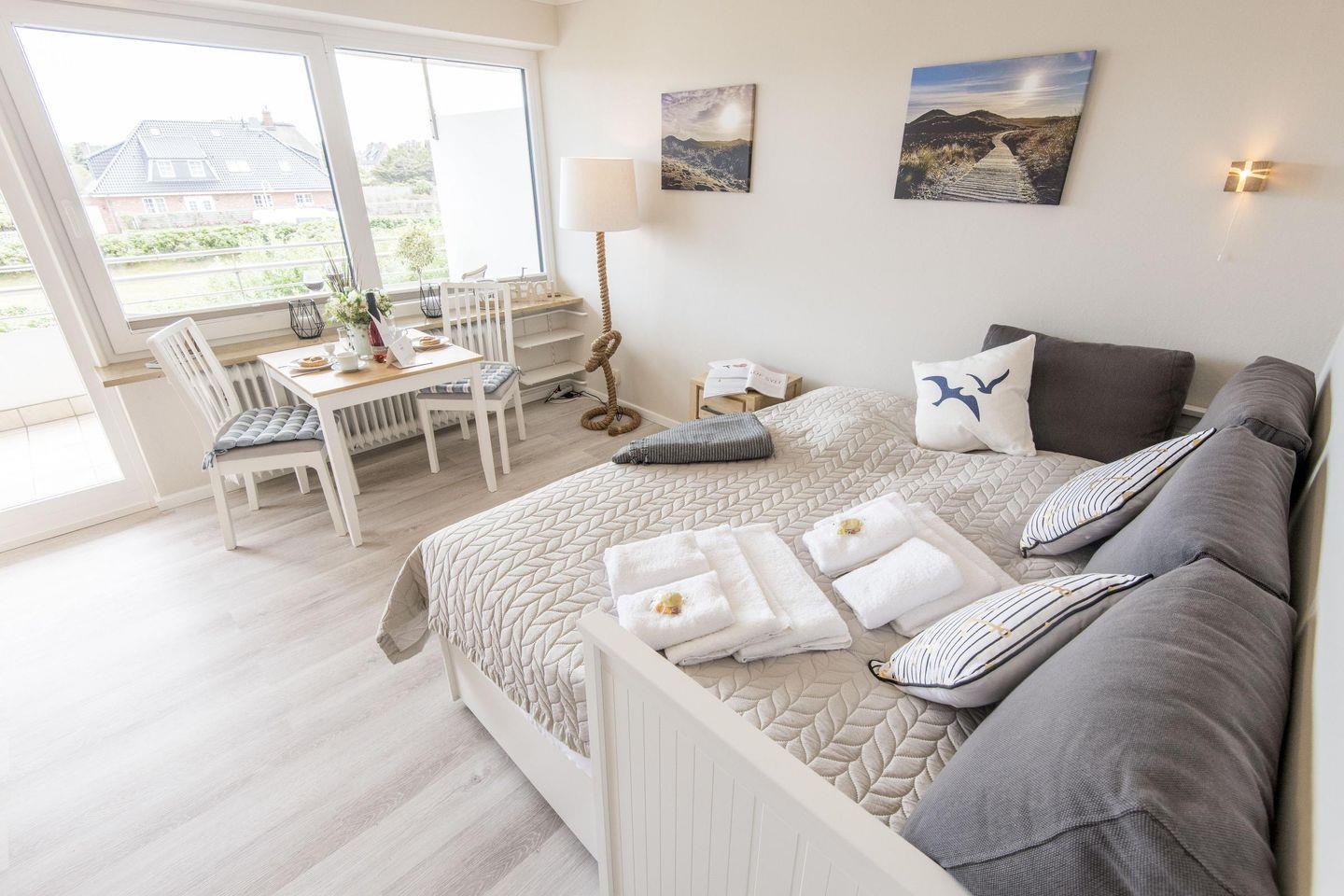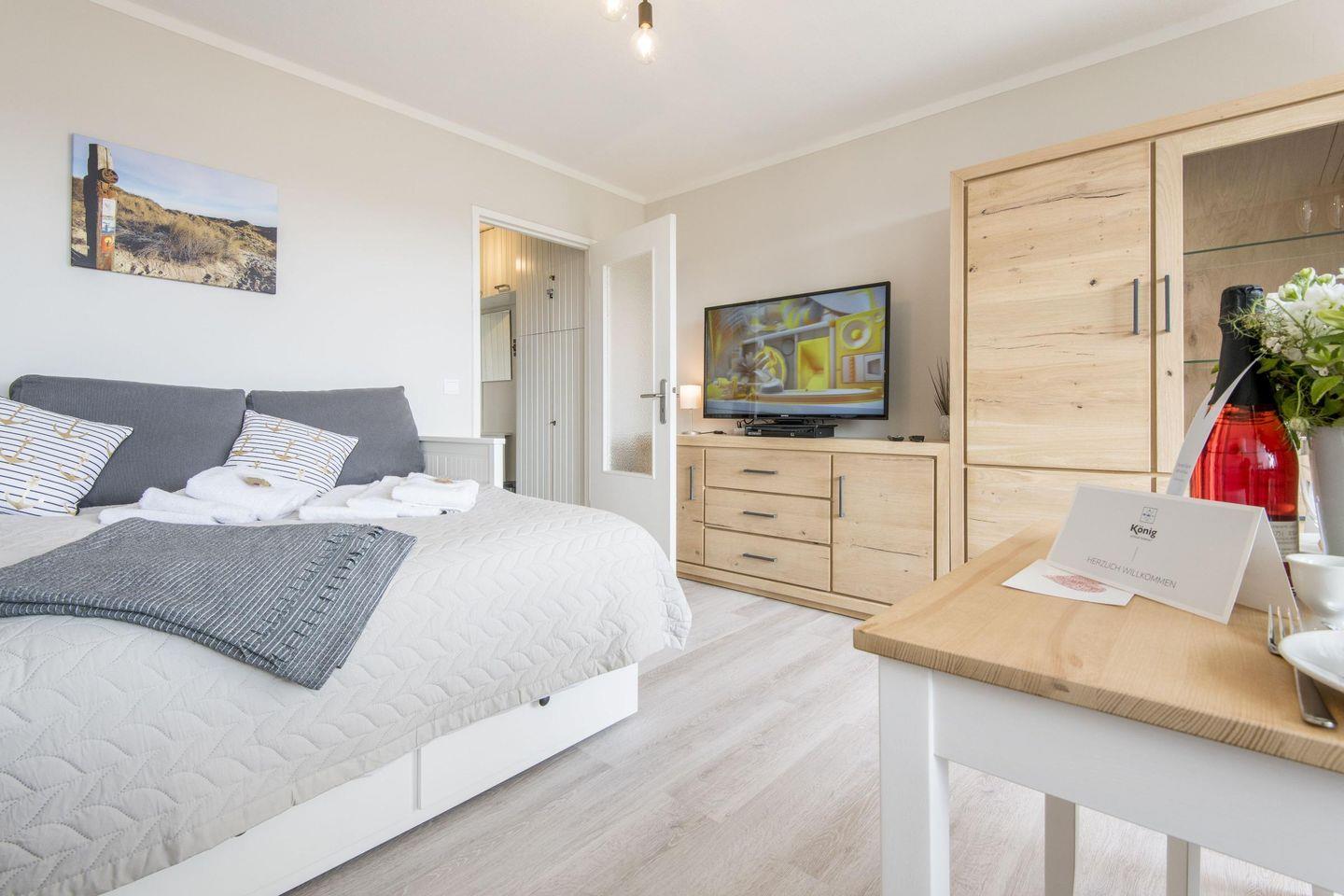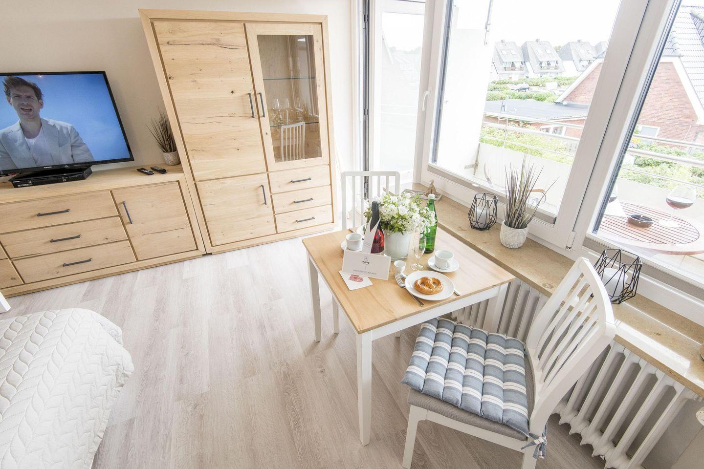 Der Wohn-/Schlafbereich ist mit einem komfortablen Doppelbett (160x200 cm) und einem TV ausgestattet, sodass Sie sich nach einem erlebnisreichen Tag entspannen können. Die gemütliche Essecke bietet Platz für zwei Personen, um gemeinsam zu speisen oder einen Kaffee zu genießen. Vom Wohnbereich aus haben Sie direkten Zugang zum Ostbalkon, auf dem Sie den Sonnenaufgang und die frische Nordseeluft genießen können.