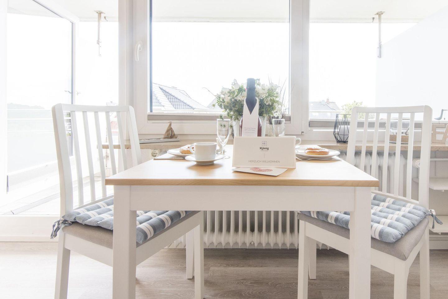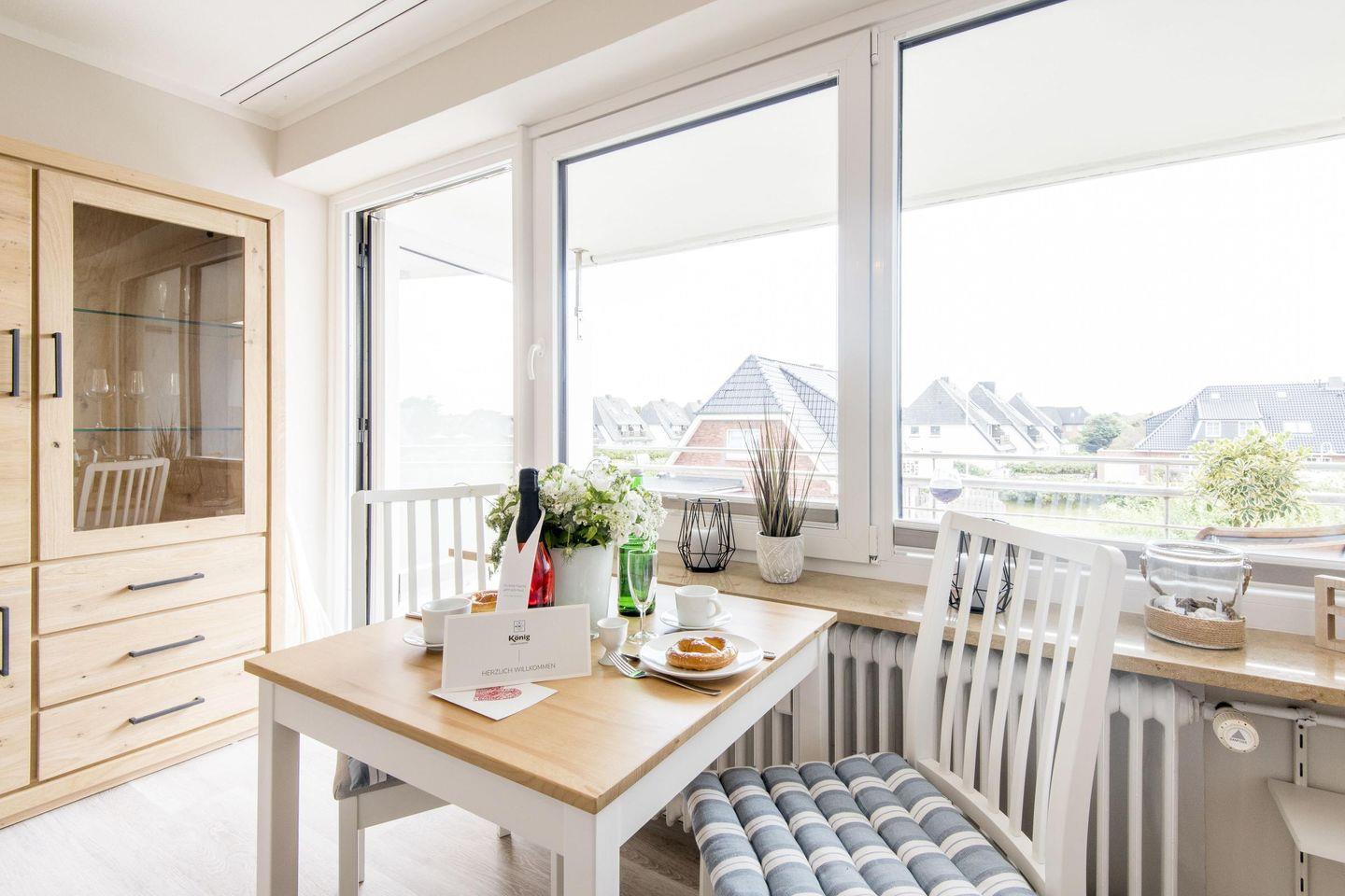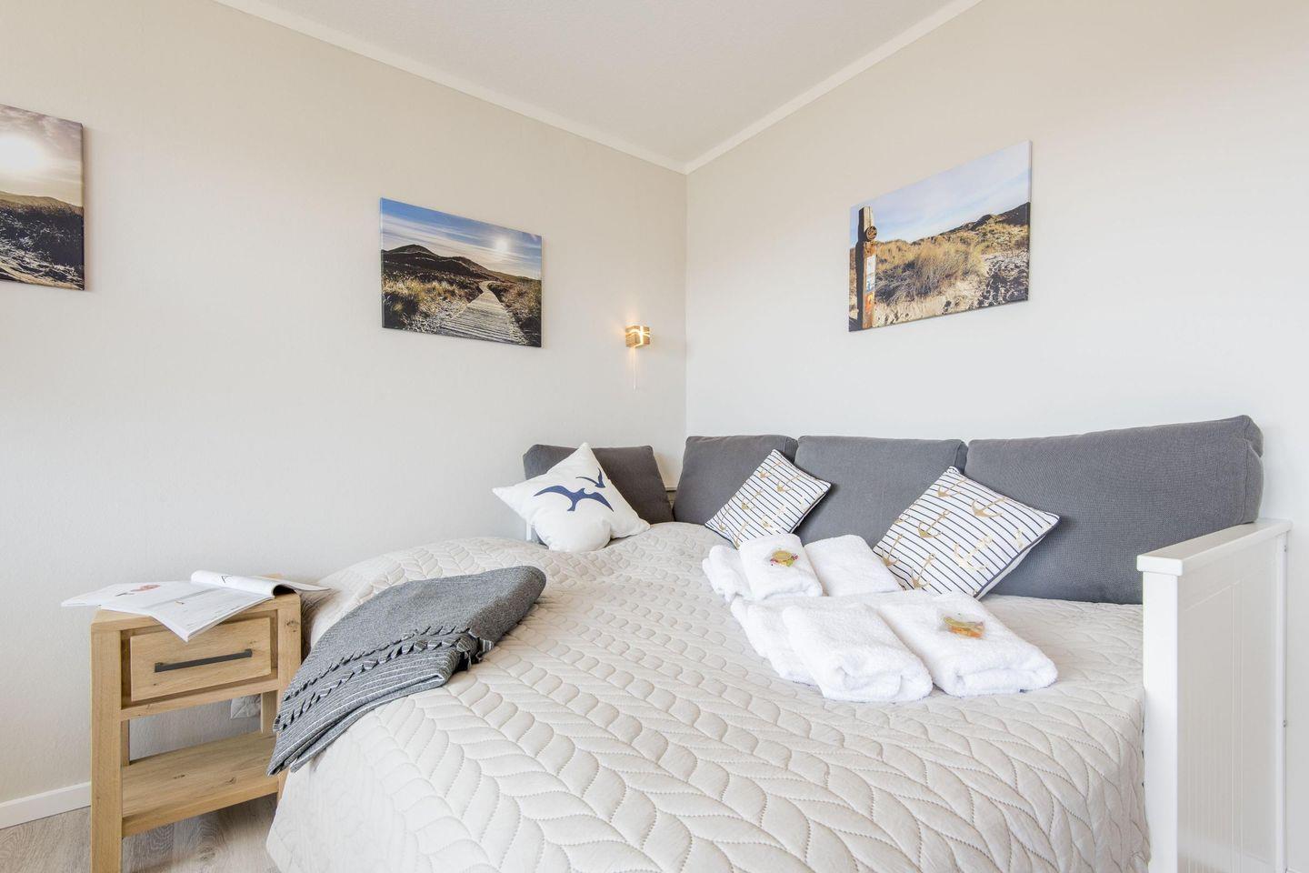 Der Wohn-/Schlafbereich ist mit einem komfortablen Doppelbett (160x200 cm) und einem TV ausgestattet, sodass Sie sich nach einem erlebnisreichen Tag entspannen können. Die gemütliche Essecke bietet Platz für zwei Personen, um gemeinsam zu speisen oder einen Kaffee zu genießen. Vom Wohnbereich aus haben Sie direkten Zugang zum Ostbalkon, auf dem Sie den Sonnenaufgang und die frische Nordseeluft genießen können.